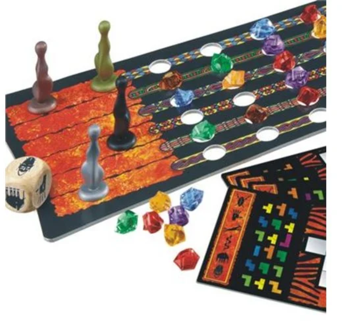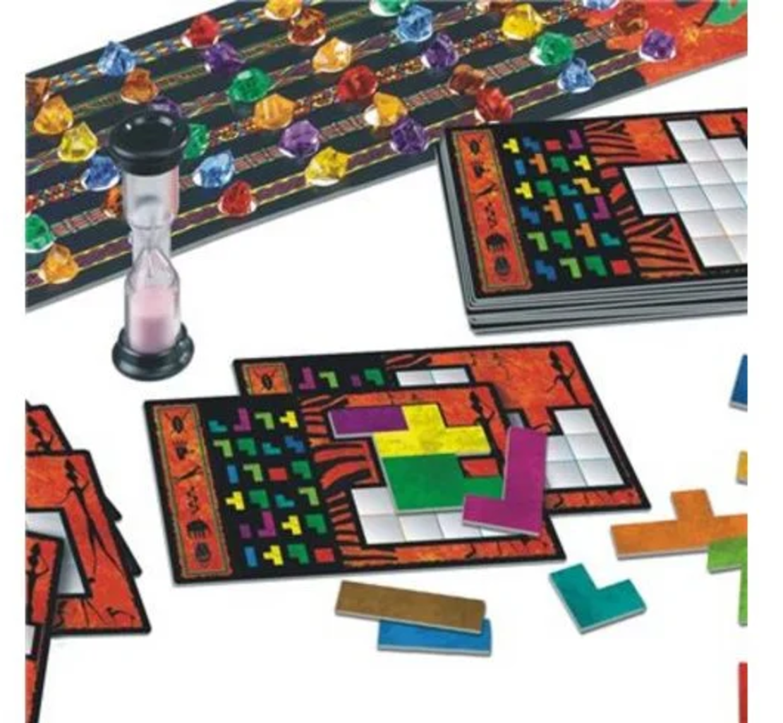 Contenido: 54 diagramas (con 648 tareas), 4 x 12 piezas de colocación, 1 dado, 1 reloj de arena, 1 bolsa de tela, 58 gemas, 1 barra redonda, 1 instrucciones de juego en alemán, 1 app adicional.