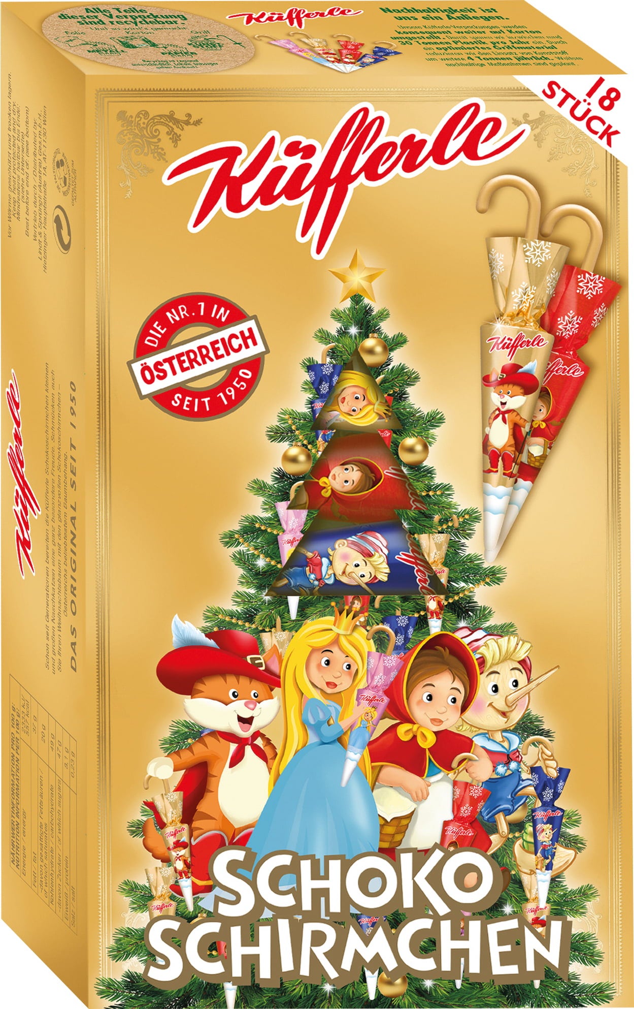 Los paraguas de chocolate de Küfferle son una decoración clásica para el árbol de Navidad en Austria y harán las delicias de grandes y pequeños con su maravilloso sabor. Este paquete contiene 18 paraguas en 4 diseños diferentes inspirados en otros tantos cuentos famosos: caperucita roja, cenicienta, el gato con botas y pinocho.