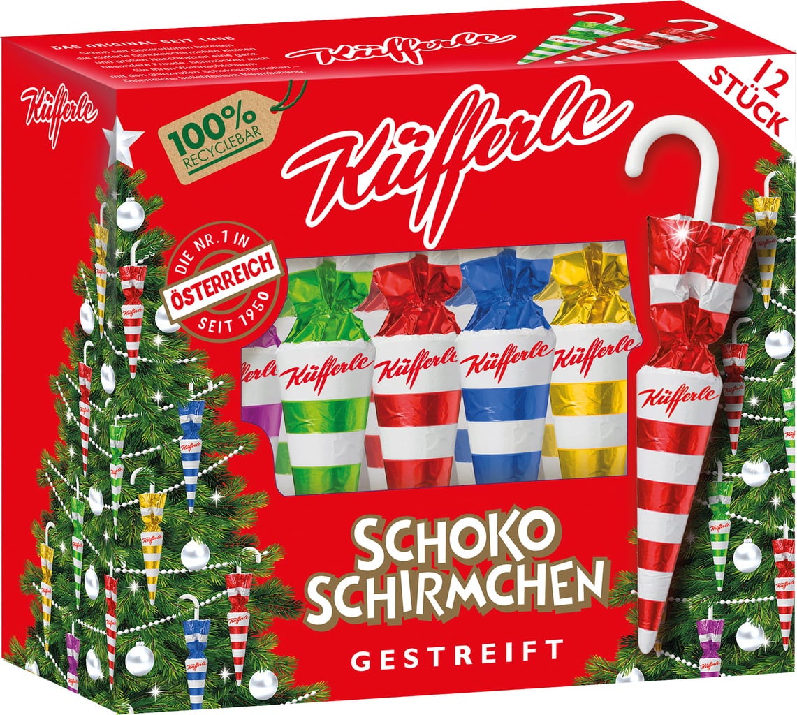 Los paraguas de chocolate de Küfferle son deliciosos durante todo el año, pero en Austria se usan tradicionalmente para decorar el árbol de Navidad. Un deleite para el paladar con su exquisito chocolate con leche y un deleite para la vista con su colorido envoltorio.