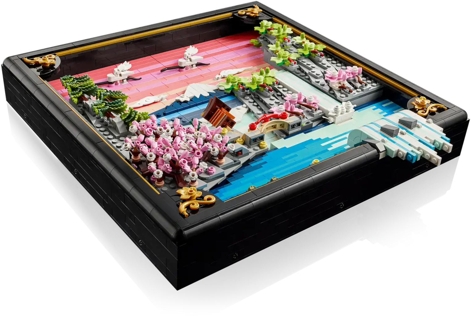 LEGO Art Set Paisaje japonés con cerezos en flor, diseñado como una magnífica decoración para construir y exponer. La obra de arte reproduce un llamativo paisaje primaveral inspirado en el arte japonés, con el monte Fuji, casa de té, puente, cascada tridimensional y árboles en flor. El marco permite exponerla tanto en la pared como en una superficie plana, ofreciendo una relajante experiencia de construcción y un elegante mueble.
