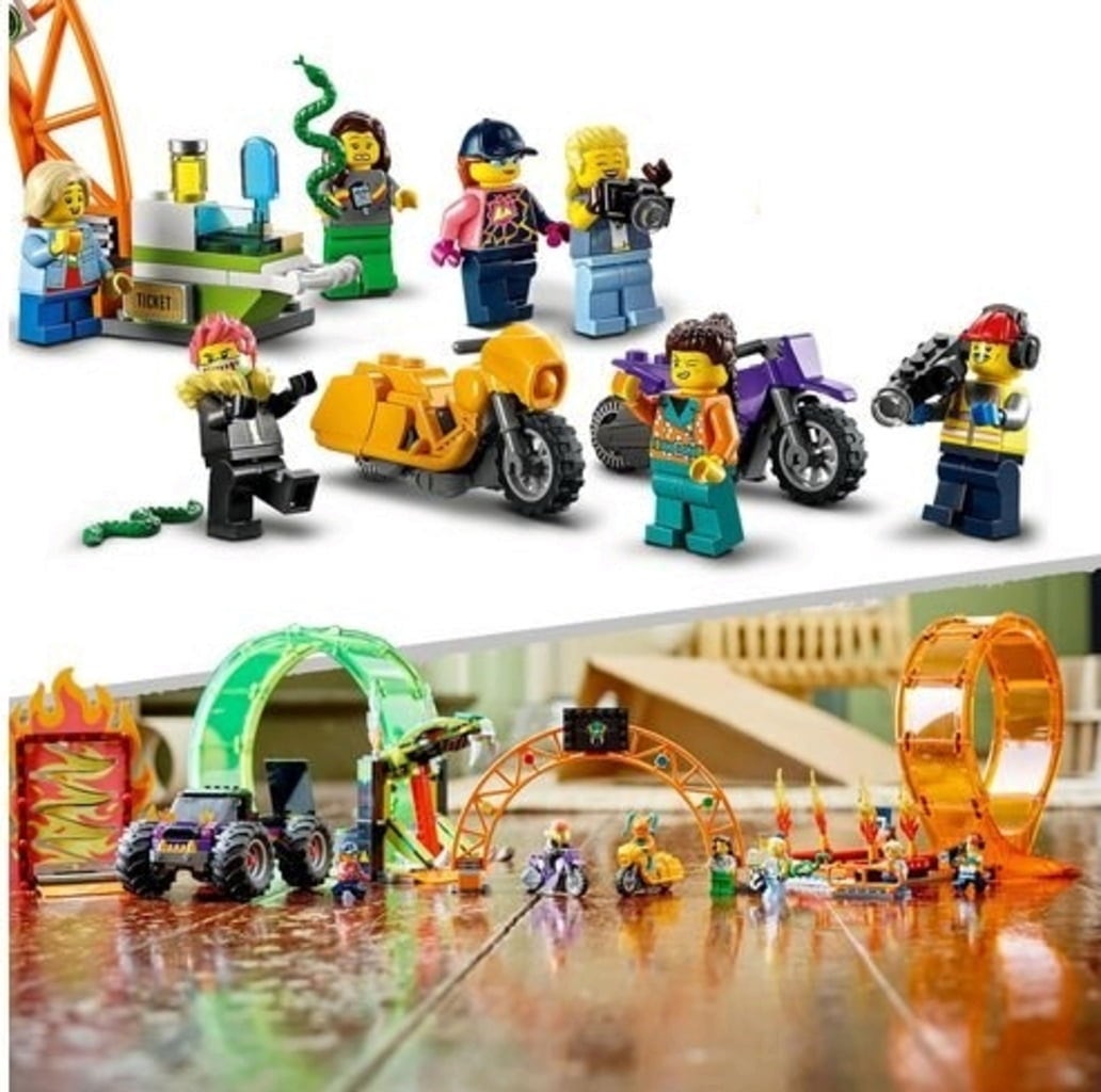 ¡Acrobacias espectaculares en LEGO City! Los visitantes se sientan en las gradas con un snack mientras rugen los motores de las dos motos acrobáticas. Los pilotos recorren los circuitos a toda velocidad, saltan por encima de la rampa y ni siquiera se detienen ante los obstáculos en llamas. Incluso el cámara apenas puede creer lo que ve.