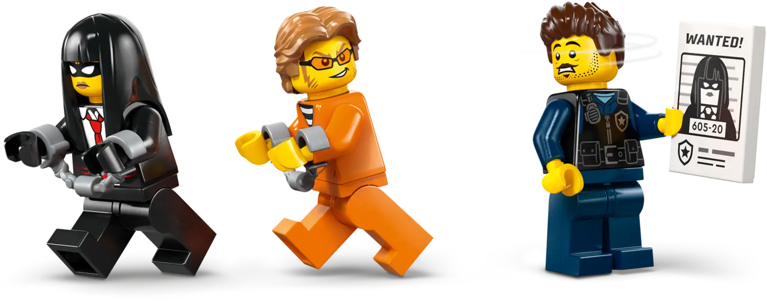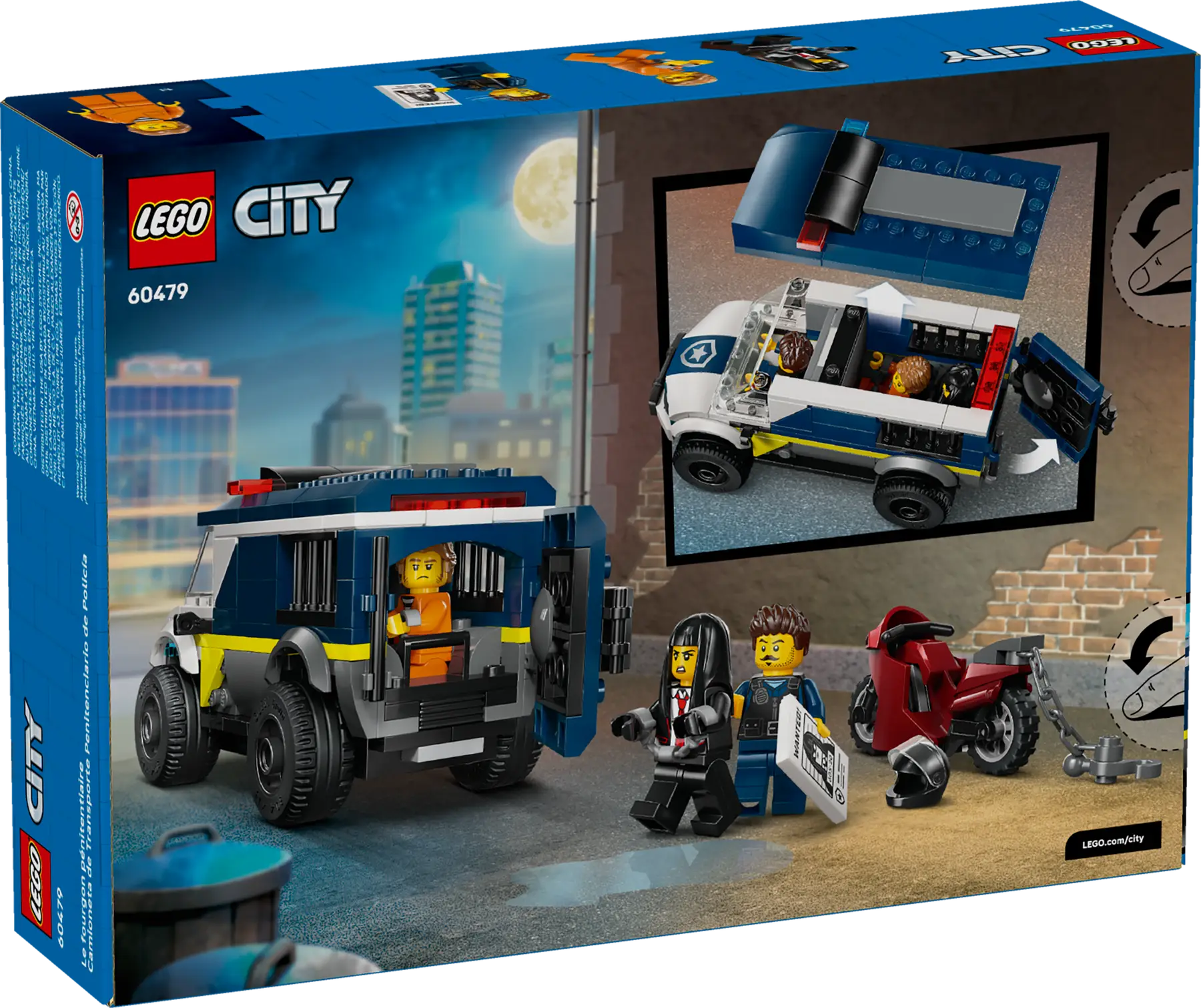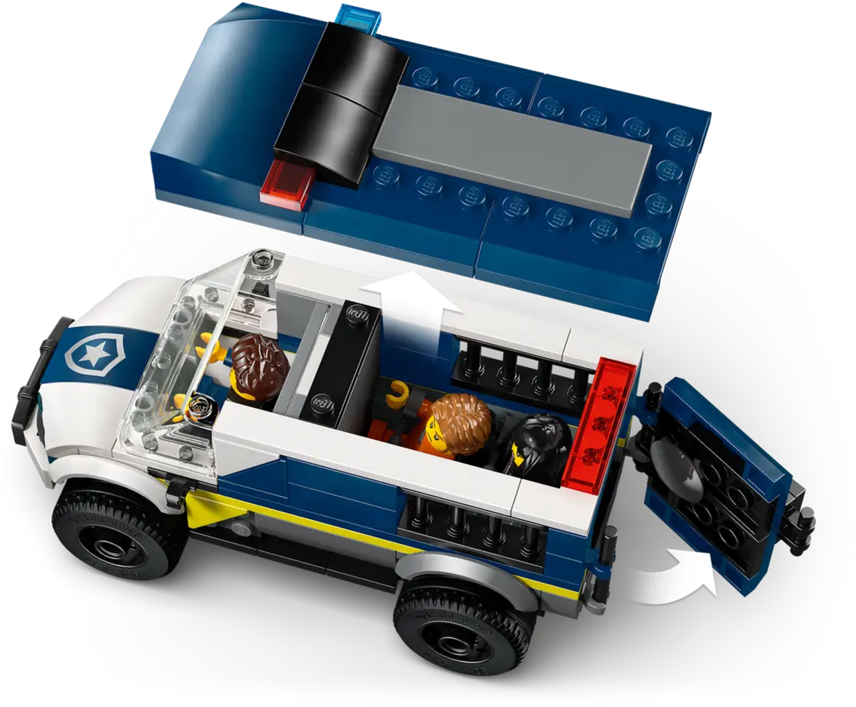 El set LEGO City Police Cell incluye una furgoneta equipada con una celda, una moto de escape y 3 minifiguras para el juego de rol. Las funciones de captura y huida estimulan la narración creativa y la imaginación, con construcción guiada por la app LEGO Builder.