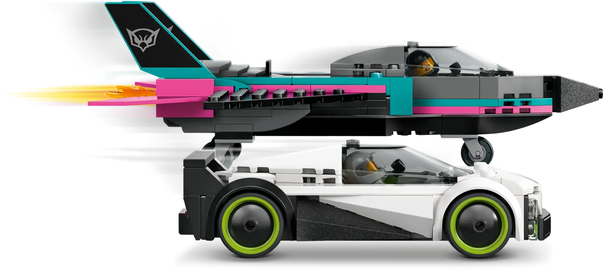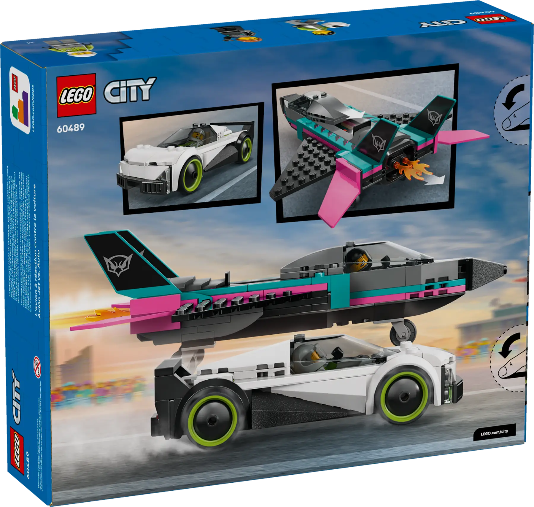 Set LEGO City Jet versus Sports Car para niños a partir de 6 años, con supercoches y jets construibles y minifiguras conductoras. Las características realistas y el diseño dinámico estimulan el juego imaginativo y los desafíos de velocidad, con una construcción intuitiva apoyada por la app LEGO Builder.