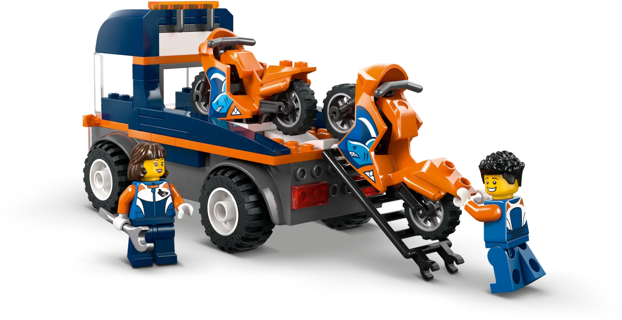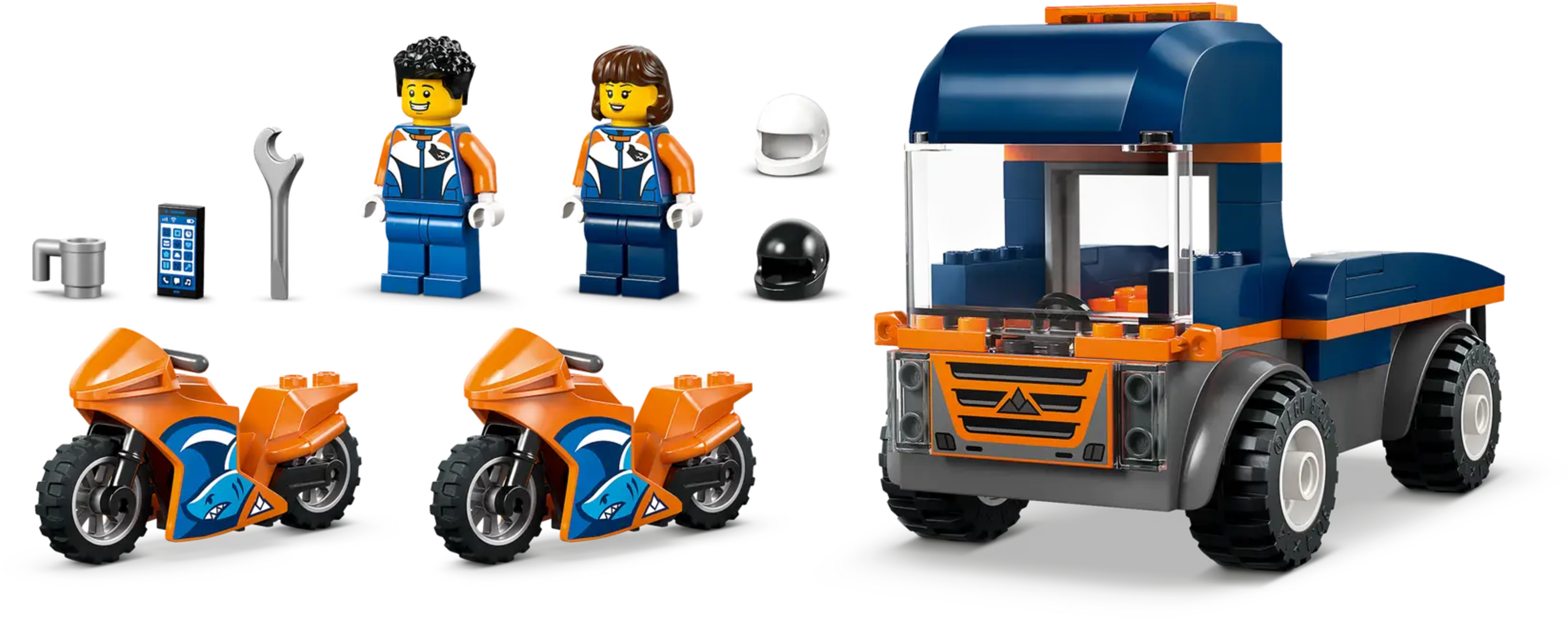 Set LEGO City Transportador de motocicletas para niños a partir de 4 años, con camión de plataforma, 2 motocicletas y 2 minifiguras conductoras. Este modelo fácil de construir, con rampa de carga y grandes neumáticos, estimula el juego imaginativo y las aventuras en la carretera, y es ideal como primer set LEGO City.