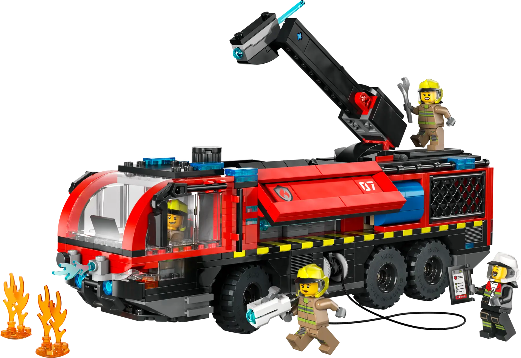 Coche de bomberos del aeropuerto LEGO City para niños a partir de 7 años, con extintor en el techo giratorio 360°, compartimentos laterales que se abren, volante funcional y 4 minifiguras de bomberos. Un vehículo de emergencia repleto de detalles que fomenta los juegos de rol y las aventuras de extinción de incendios, que también puede construirse con ayuda de la app LEGO Builder.