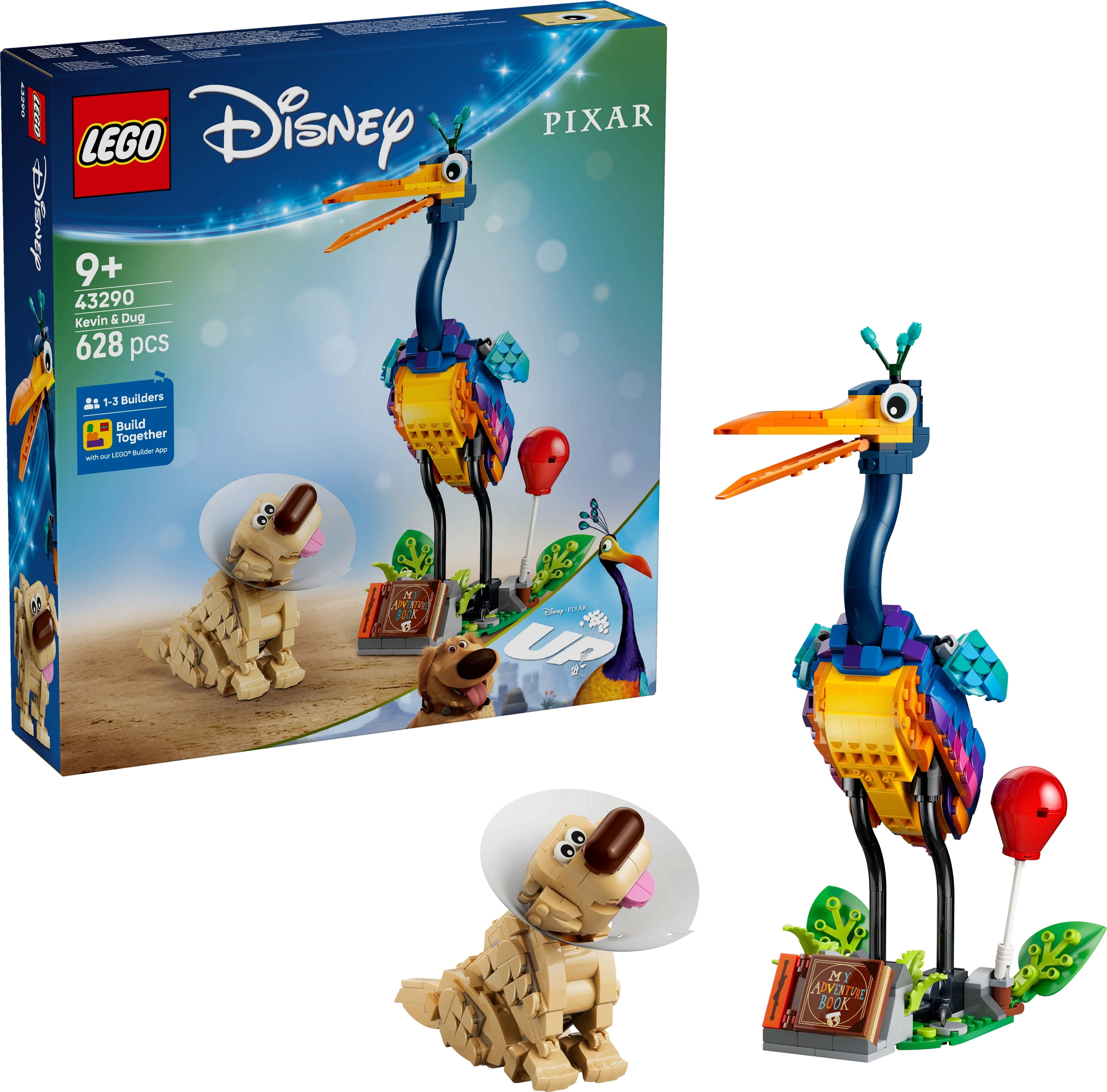 Este set de construcción y juego contiene por primera vez a los dos personajes -el pájaro Kevin y el perro Dug- de la popular película "Up". Dug tiene incluso su collar especial, el "cono de la vergüenza" y el legendario libro de aventuras. El set se completa con una base de presentación con hojas móviles y accesorios.