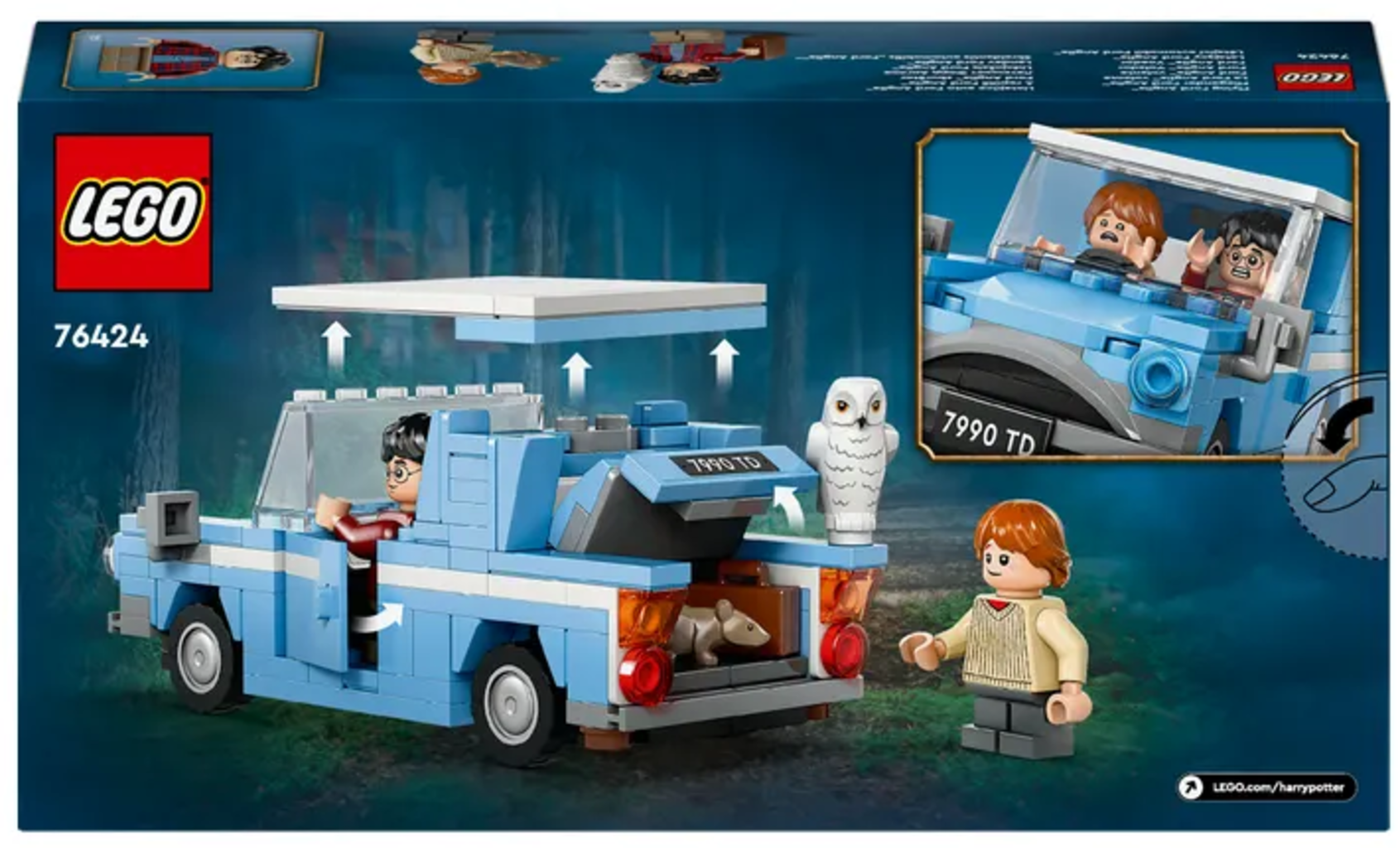 Con este set LEGO podrás recrear esta divertida escena. El coche, un Ford Anglia azul, tiene maletero y puertas que se pueden abrir. Además, el techo se puede quitar para que puedas meter en el coche a los personajes de Harry y Ron. En el asiento trasero hay sitio para Hedwig, la fiel lechuza de Harry, y también para Scabbers, la rata de Ron.