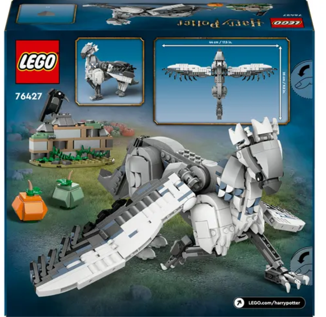 El personaje de Buckbeak está totalmente articulado y permite al hipogrifo adoptar distintas posturas: puede inclinarse, desplegar las alas como si volara o caminar majestuosamente. Como Buckbeak esperaba a ser ejecutado en el jardín de Hagrid, el set incluye también 2 calabazas y un pájaro para representar perfectamente la escena.