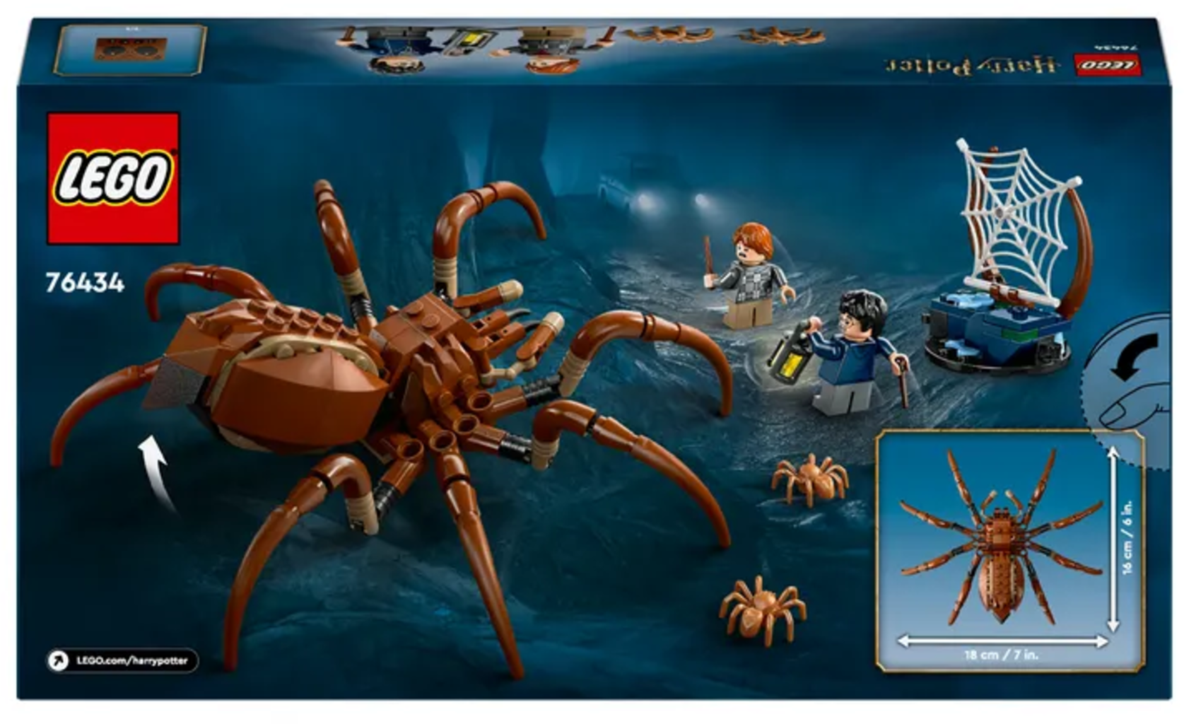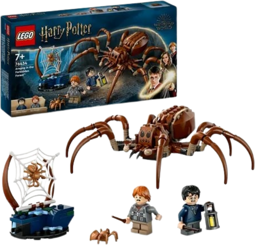 Aragog puede mover las patas, los colmillos venenosos y las almohadillas de los pies. El set también incluye figuras de Harry y Ron, con caras felices o asustadas. Dos pequeñas arañas y una telaraña crean el fondo perfecto para jugar