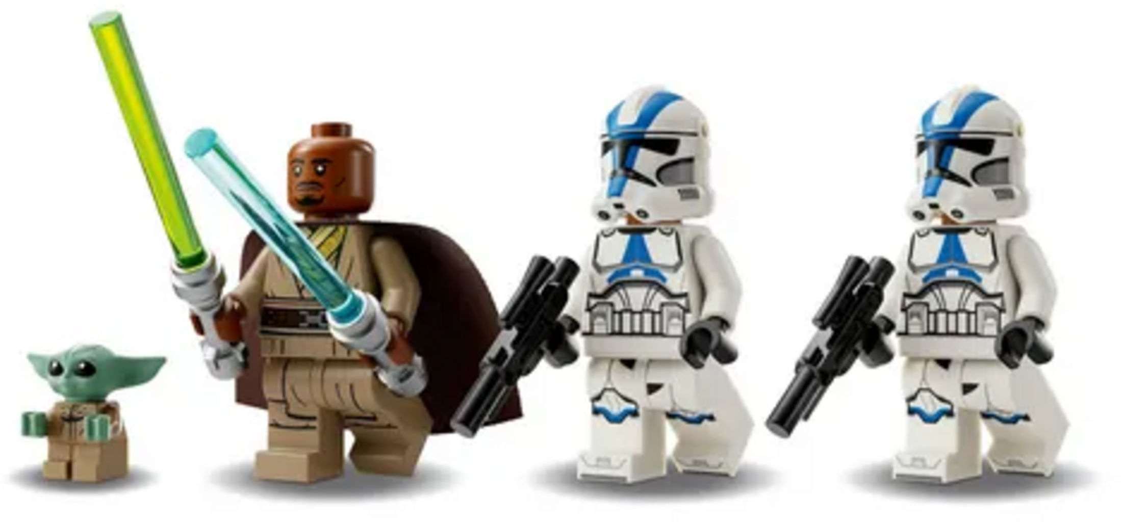 - Kelleran Beq, 2 minifiguras Clone Troopers y figura Grogu.