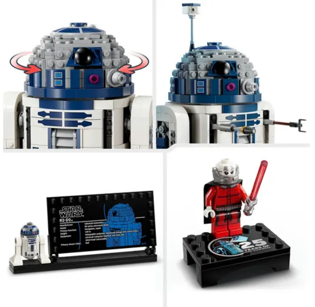 El droide más famoso del universo Star Wars como pieza de coleccionista de 24 cm de altura que embellecerá tu hogar. Tiene una cabeza giratoria y muchos accesorios opcionales para exhibirlo como desee. La peana con panel informativo y un mini R2-D2 le dan el toque final. Para celebrar el 25 aniversario de LEGO Star Wars, también se incluye la minifigura exclusiva de Darth Malak.