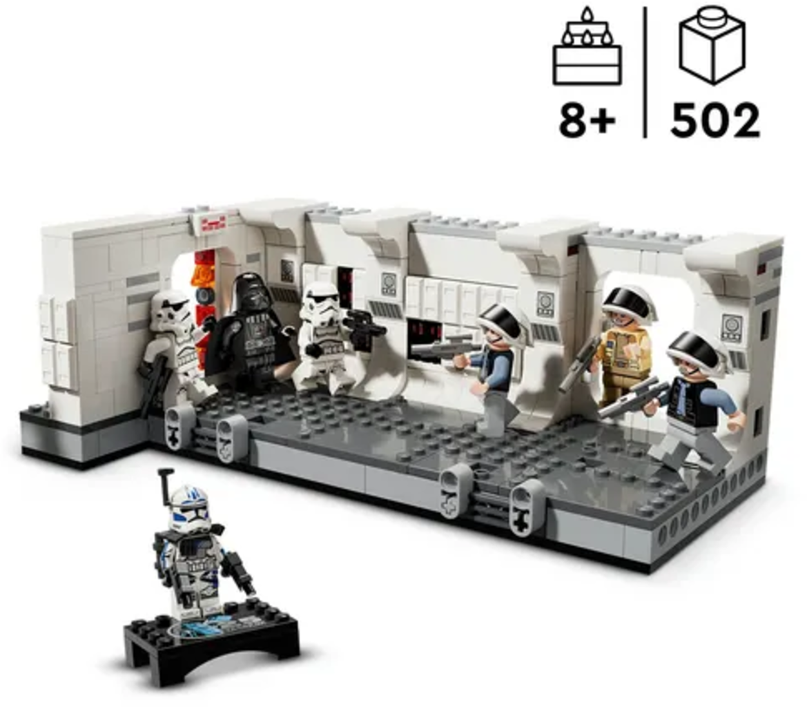 Cuando el Tantive IV es abordado, el Capitán Antilles y los rebeldes se preparan para una feroz batalla. Los primeros soldados de asalto ya se abalanzan sobre ellos. Pero entonces el mismísimo Darth Vader interviene en la lucha y las esperanzas de los rebeldes se desvanecen. Este kit lleno de acción rememora un momento icónico de la película Star Wars: Una nueva esperanza.