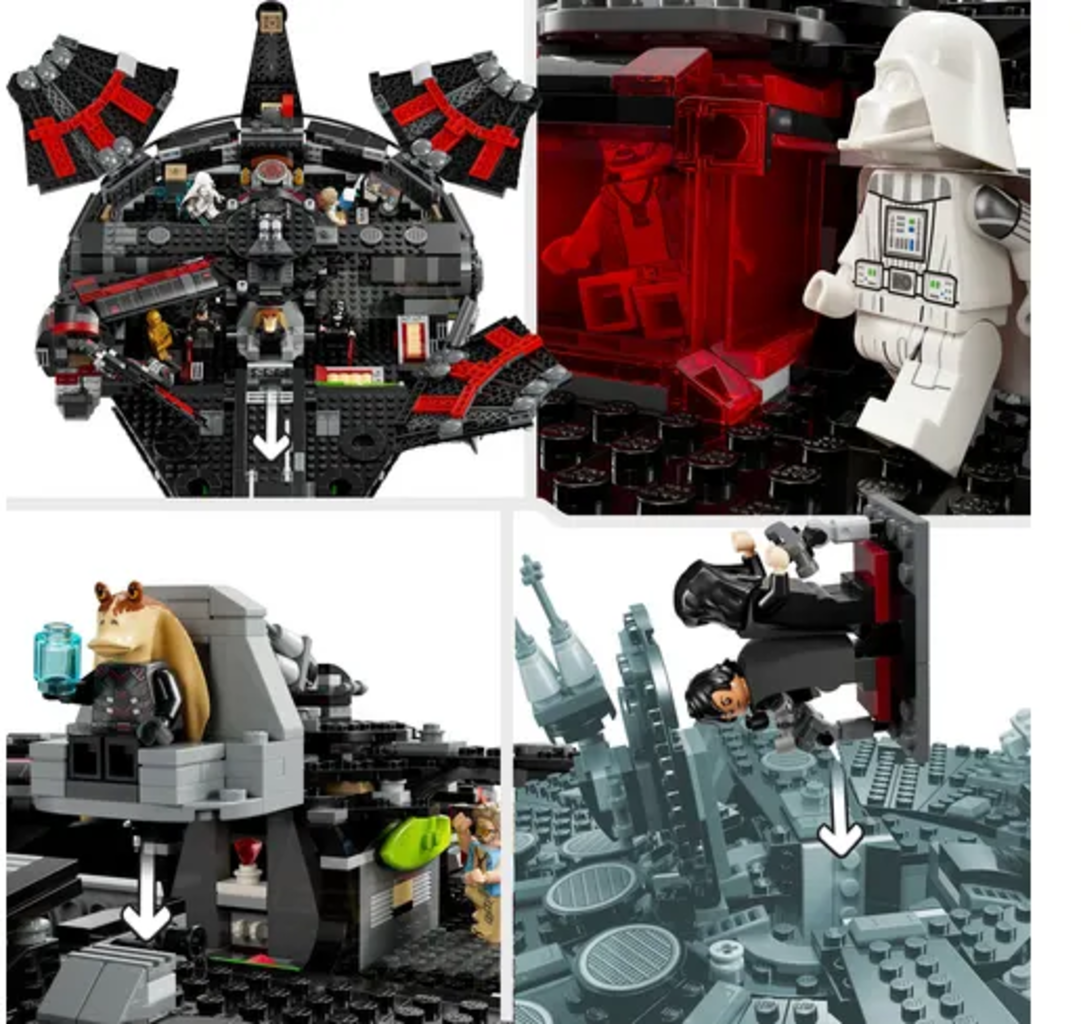 - 6 minifiguras: Darth Jar Jar, el cazarrecompensas C-3PO, Darth Dev, Darth Rey, Luke en versión playa y el Jedi Vader.