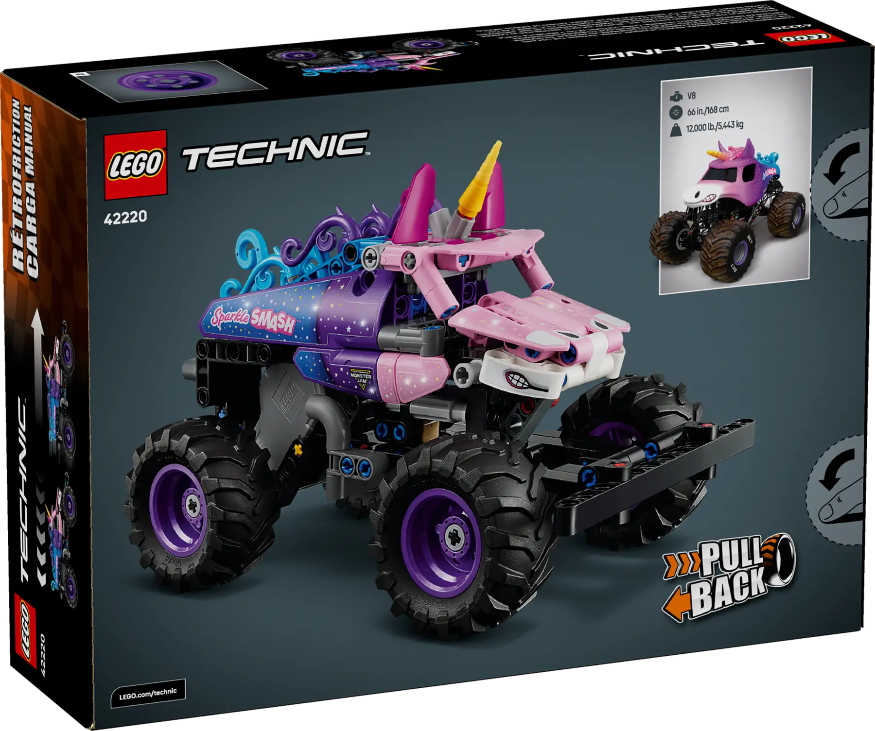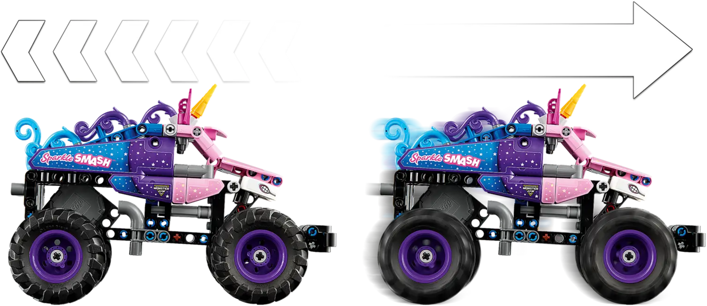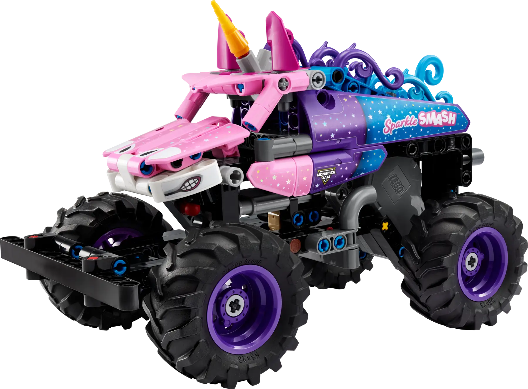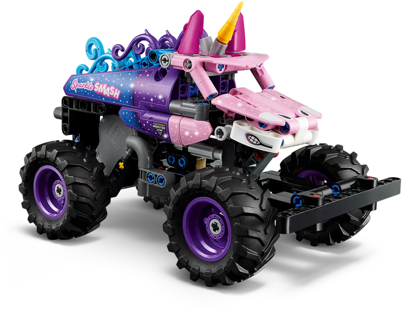 LEGO Technic Monster Jam Sparkle Smash para niños a partir de 7 años, con función de carga trasera para acción dinámica y acrobacias. El modelo reproduce el famoso camión con detalles temáticos de unicornio y estimula el juego creativo y la imaginación, ofreciendo una experiencia de construcción envolvente incluso con la app LEGO Builder.