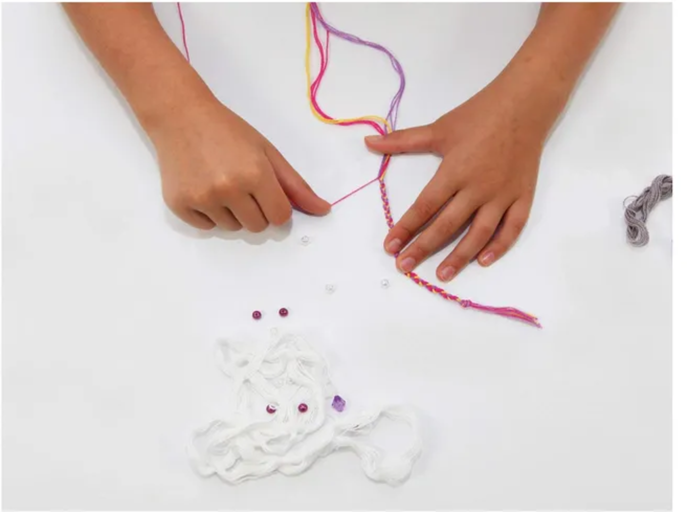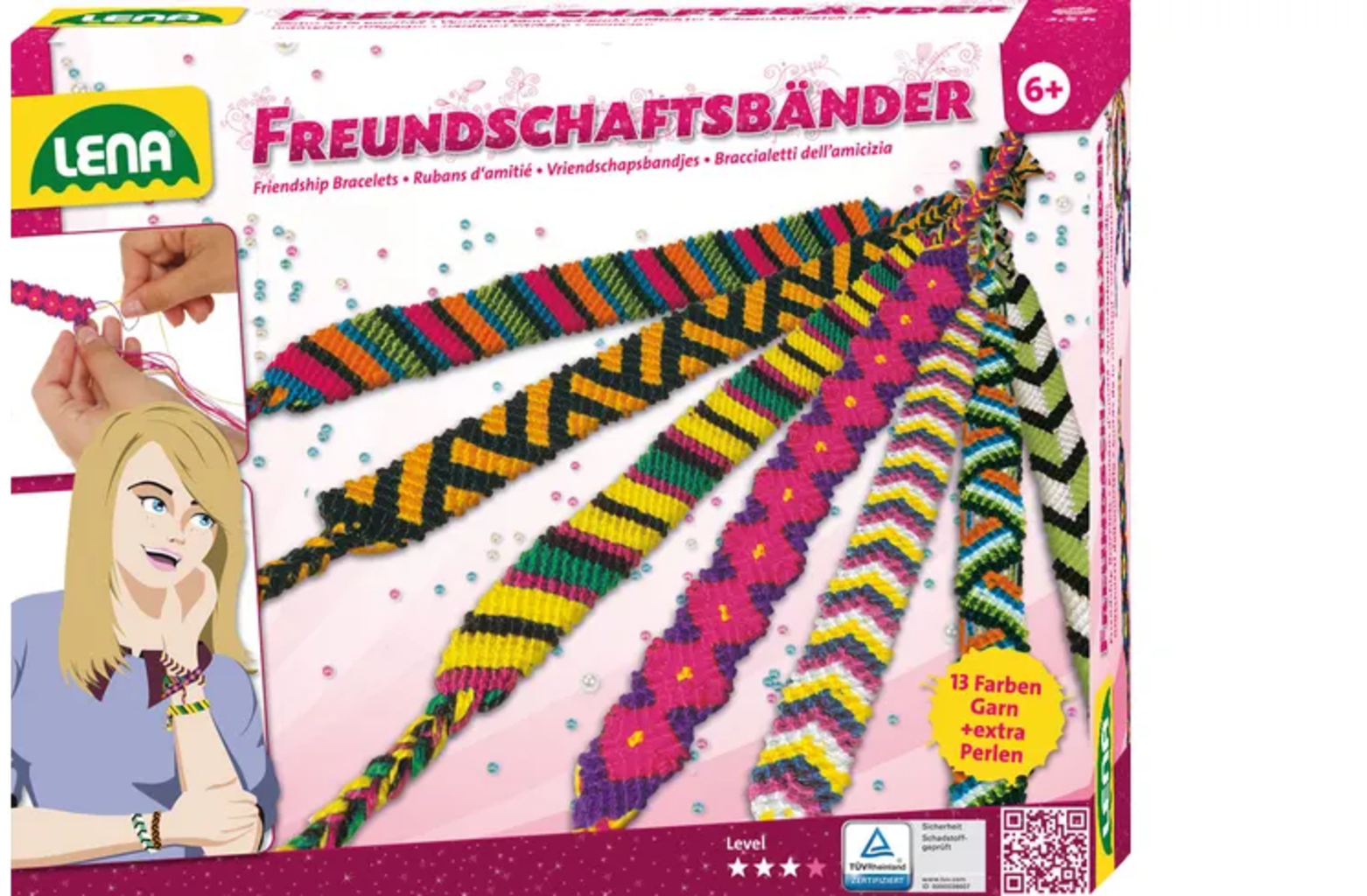 - Contenido: hilo en 13 colores diferentes y cuentas.