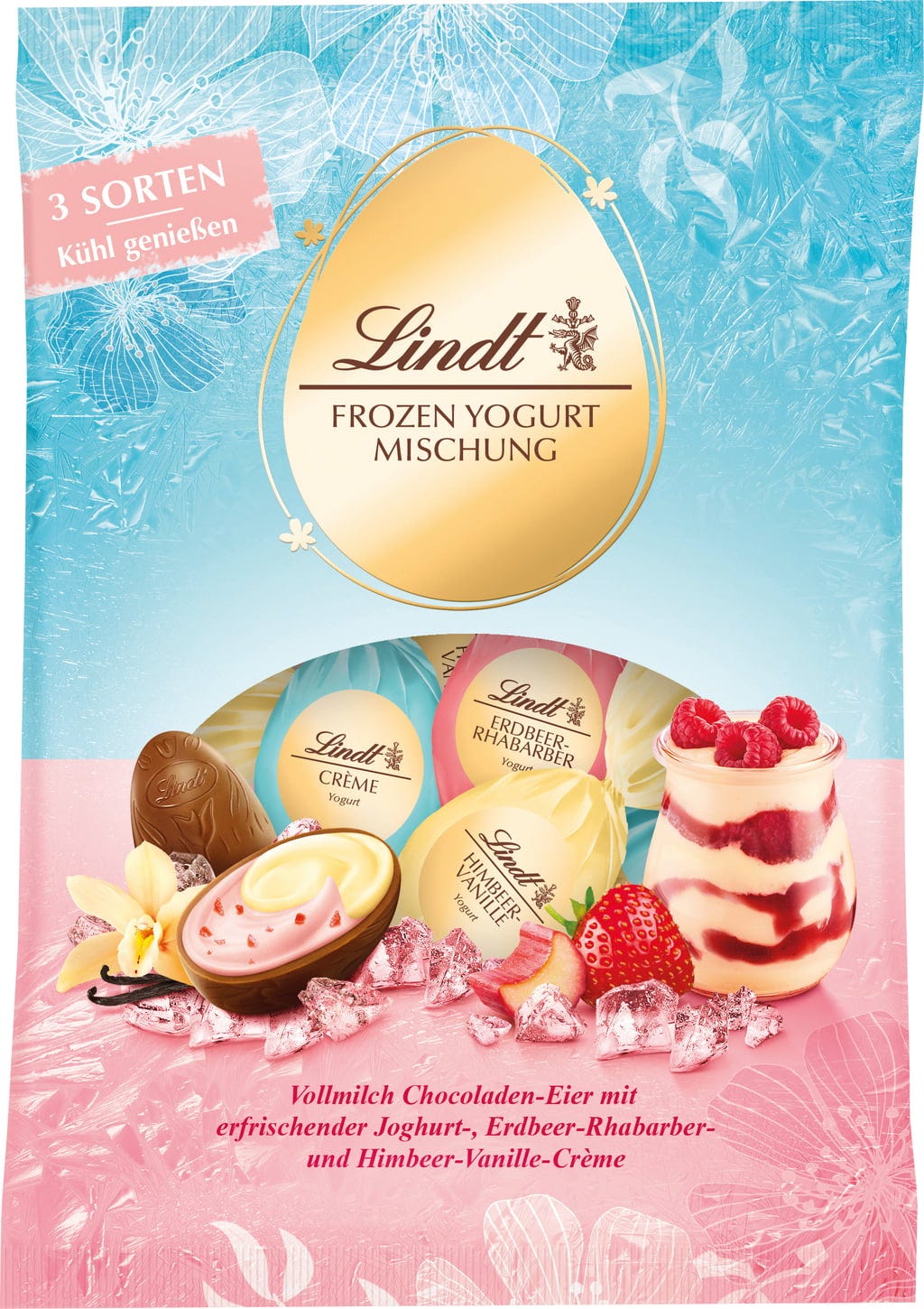 Los Huevos Frozen Yoghurt Lindt están hechos con el chocolate con leche más suave y rellenos de 3 rellenos diferentes: Yogur, fresa-ruibarbo y frambuesa-vainilla. Los huevos de yogur helado saben mejor si se han enfriado previamente.
