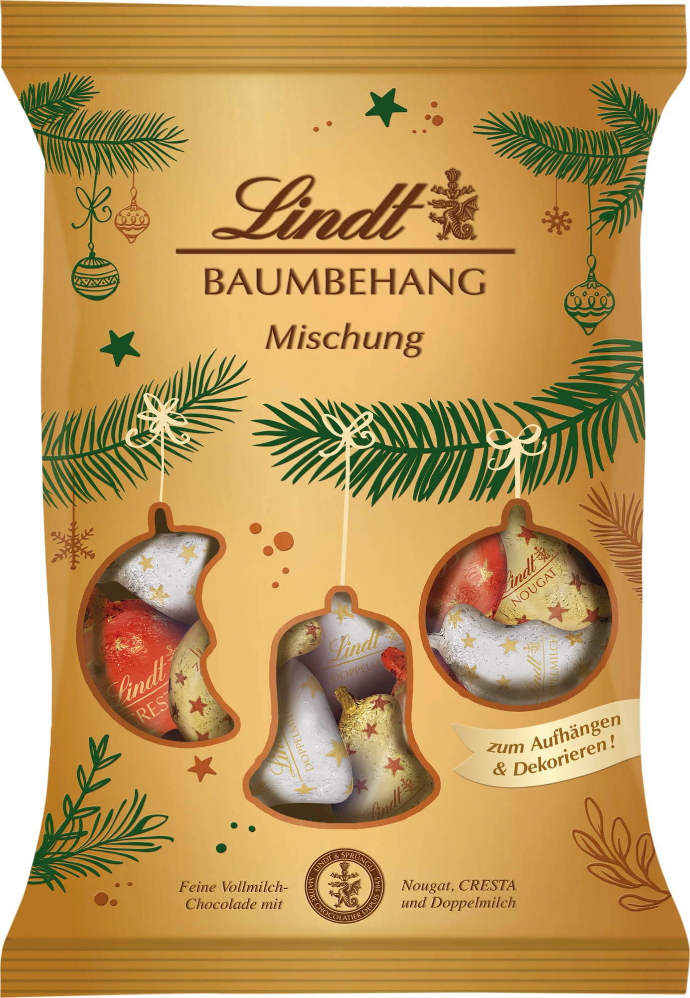 Una maravillosa mezcla para decorar tu árbol de Navidad o simplemente para crear un ambiente navideño festivo en tu hogar. La mezcla contiene deliciosas especialidades de Lindt con bonitas formas navideñas en 3 variedades diferentes: turrón, cresta (crocante de almendras crujientes y crema de avellanas) y doble chocolate con leche.