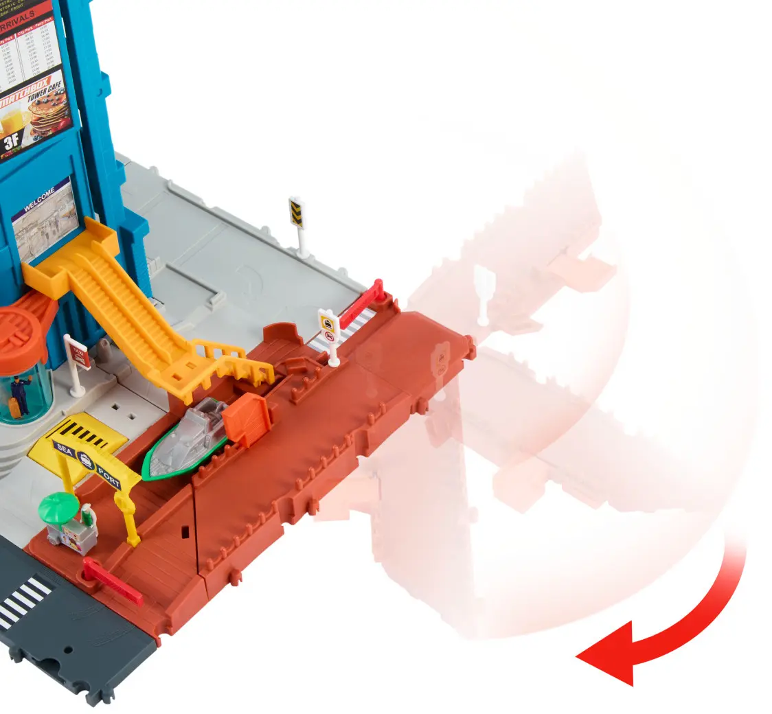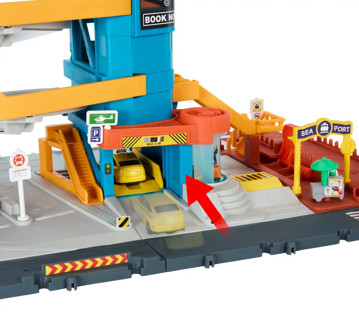 - Set de juego compuesto por aparcamiento de 5 plantas, muelle para barcos y helipuerto