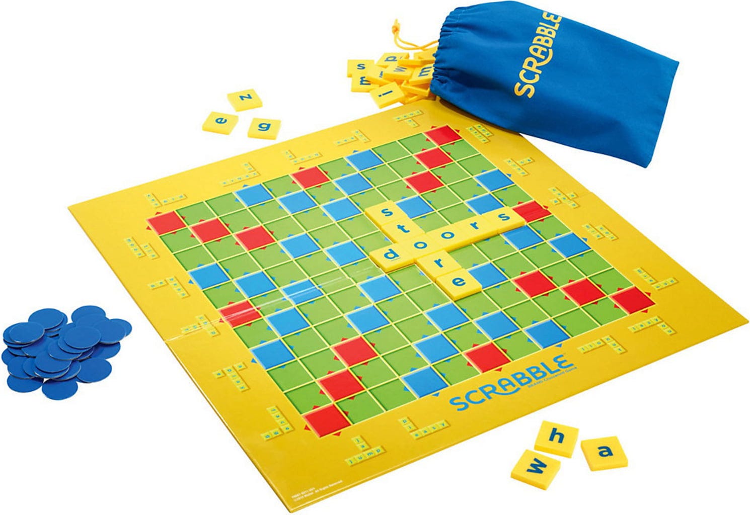 Contenido: tablero de juego, 30 marcadores azules, 84 fichas de letras, estuche, instrucciones.