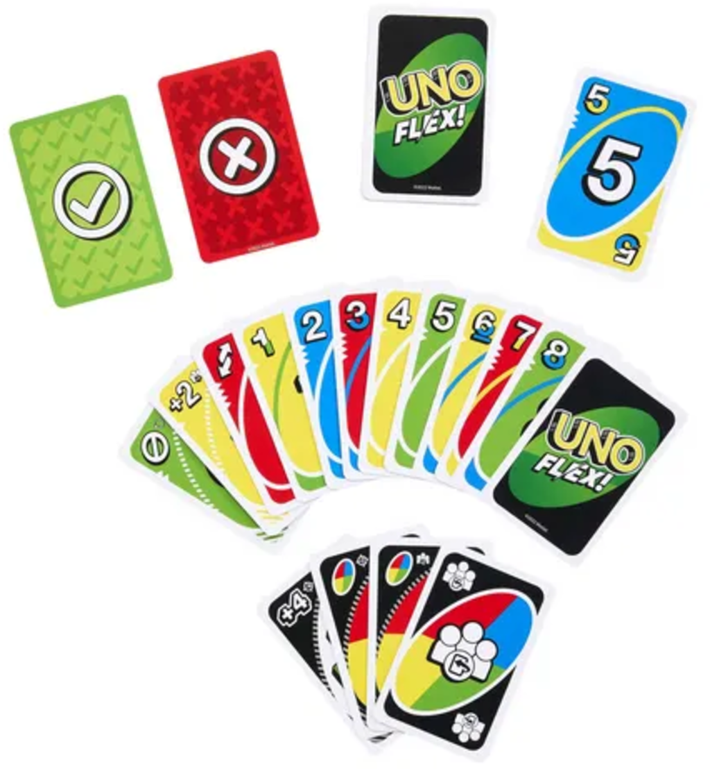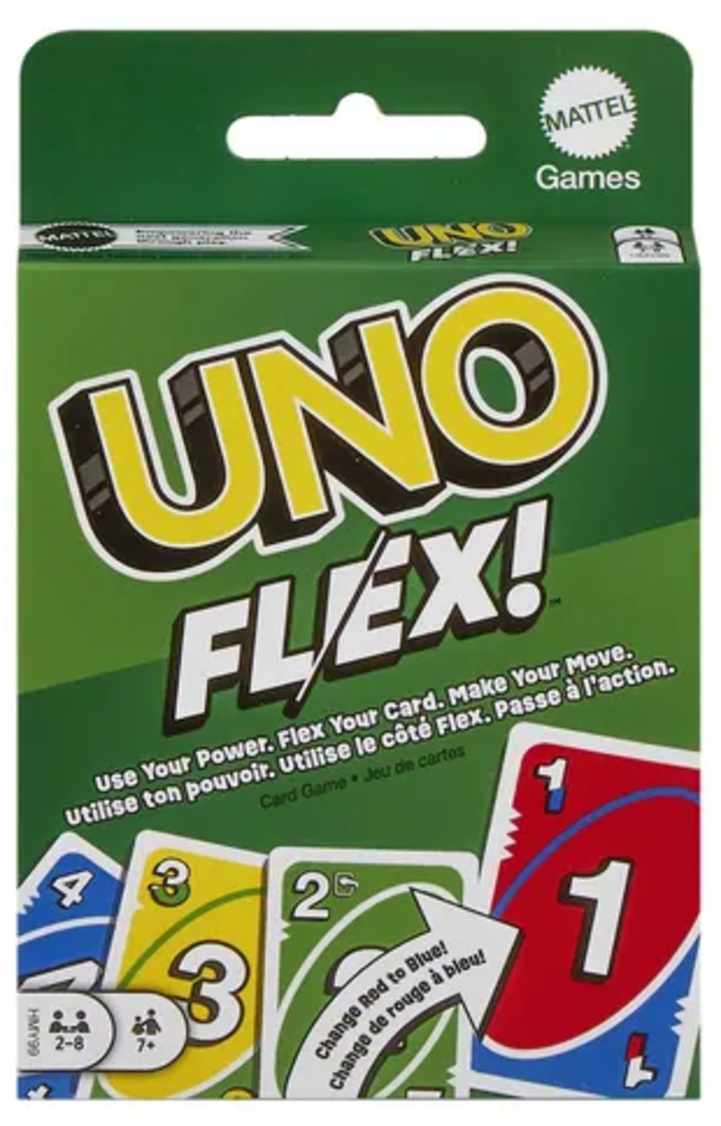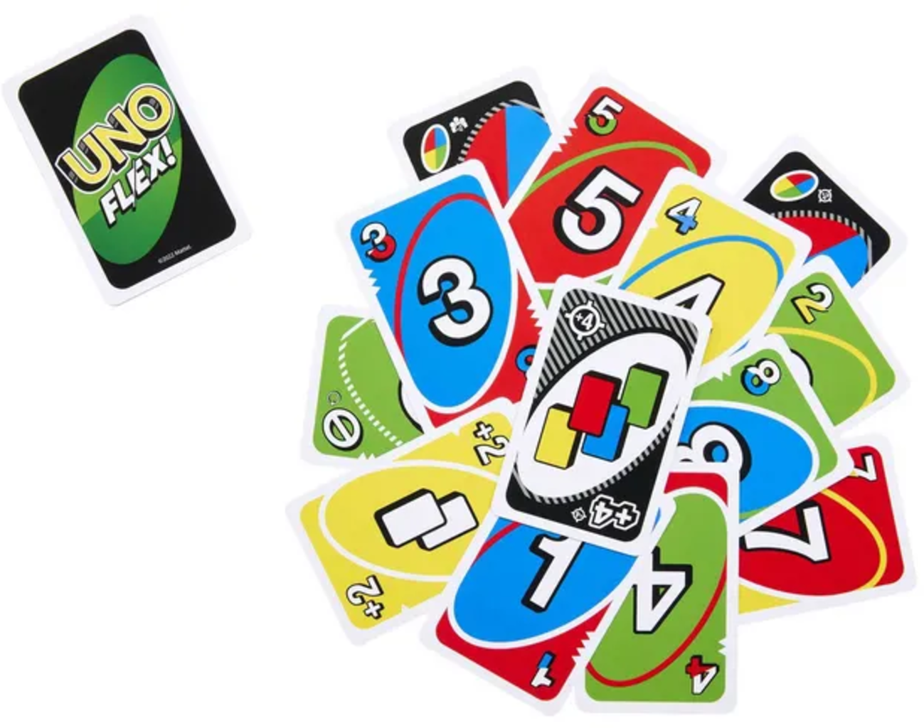 Tan divertido como el original, pero UNO Flex es aún más emocionante. Estas cartas se basan en el juego original y te permiten cambiar de color aunque el color jugado no coincida. Por ejemplo, si el 4 rojo de la esquina muestra un punto verde, entonces puedes convertirlo en un 4 verde. Las cartas de poder y las cartas de acción flexibles hacen que el juego sea aún más emocionante. Diversión garantizada para toda la familia. Por supuesto, con el habitual efecto UNO: si sólo tienes una carta en la mano, ¡tienes que gritar "UNO" en voz alta!