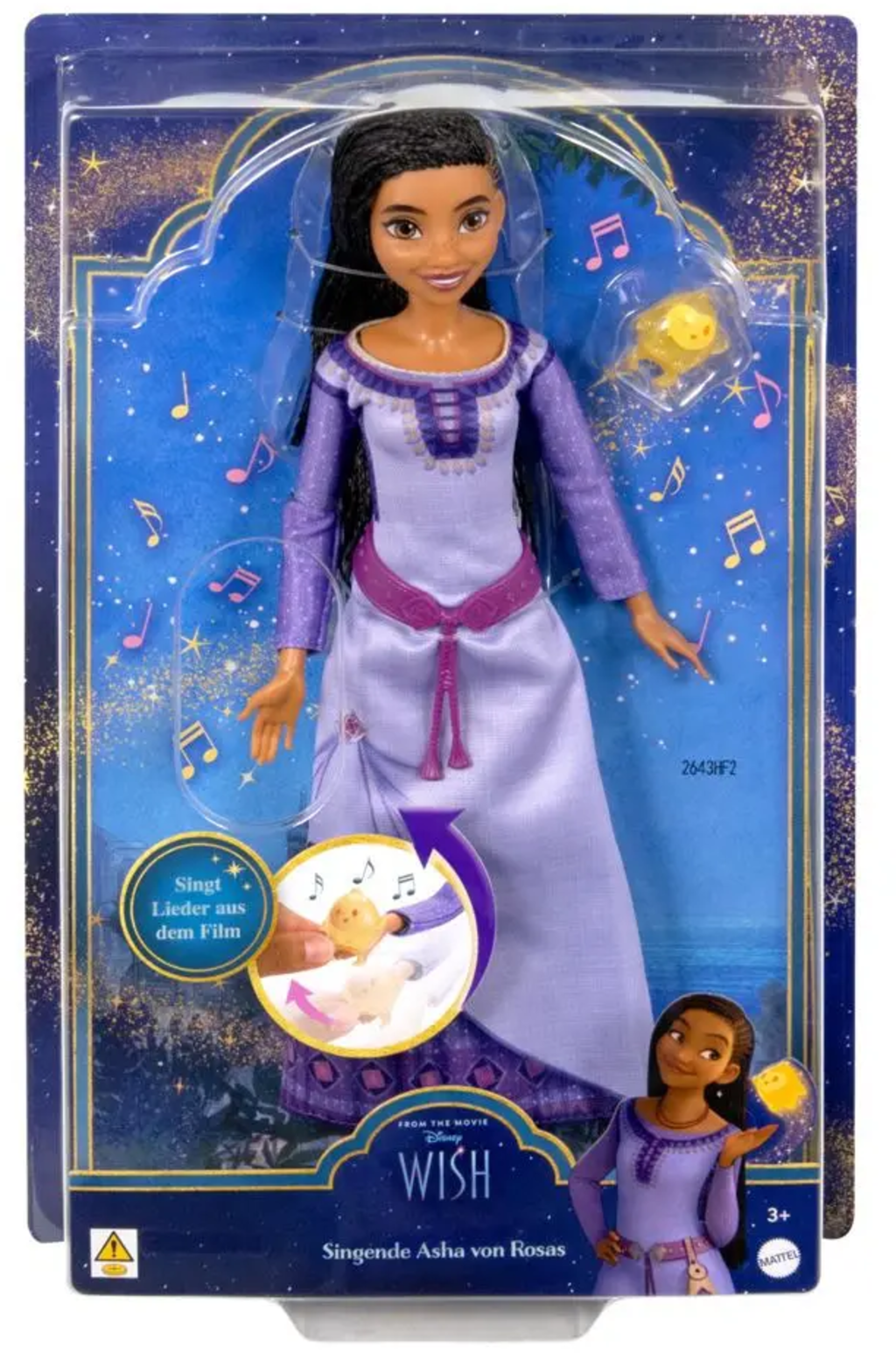 La muñeca cantante de Asha, de la película de Disney Wish, lleva la magia de los deseos directamente a la habitación de los niños. Al levantar la mano, se activa un fragmento de su famosa canción, ideal para cantar y recrear los mejores momentos de la película. Gracias a las articulaciones móviles, la ropa de quita y pon y el simpático personaje de Wish, los niños podrán dar rienda suelta a su imaginación y vivir aventuras únicas.