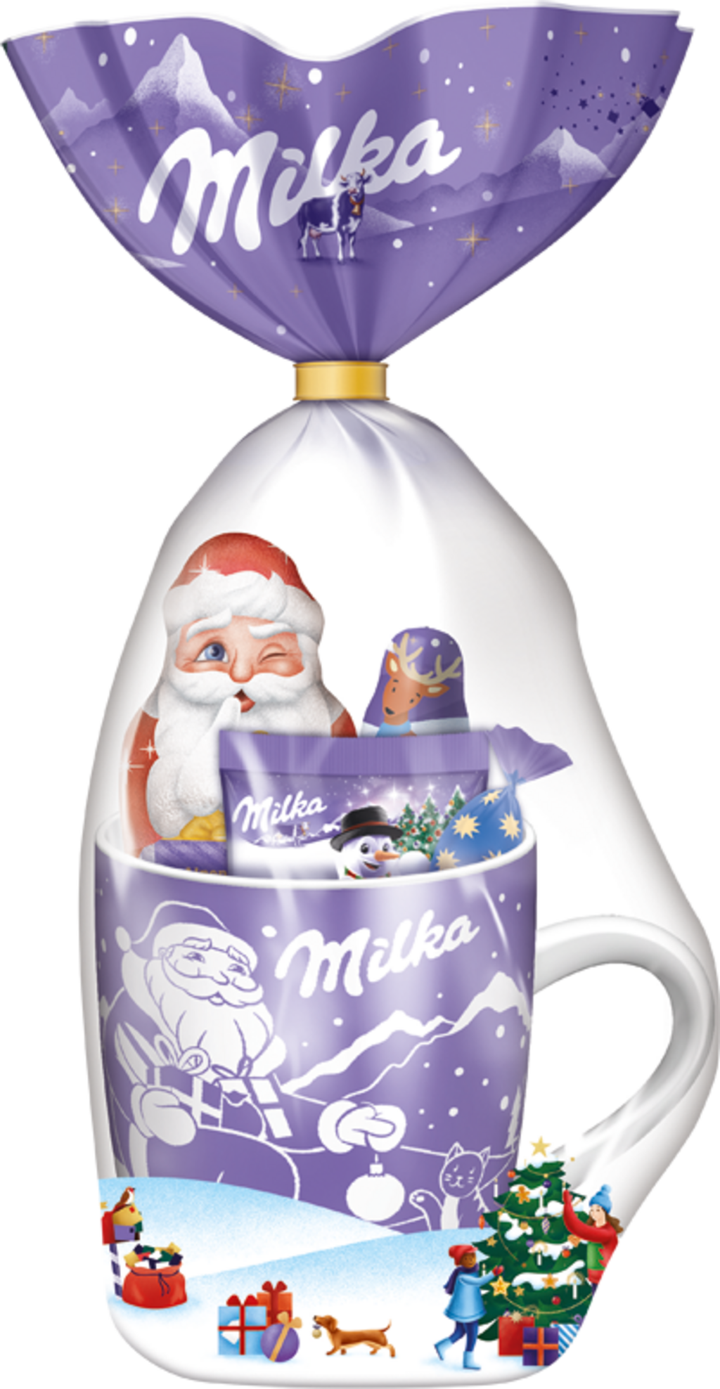 La taza navideña de Milka está llena de delicias: bombones de chocolate, dulces azucarados, figuritas navideñas de chocolate con leche, etc. Además, una vez que hayas probado los dulces, la taza se puede utilizar para beber chocolate caliente, té o café. Una bonita idea de regalo para jóvenes y mayores.