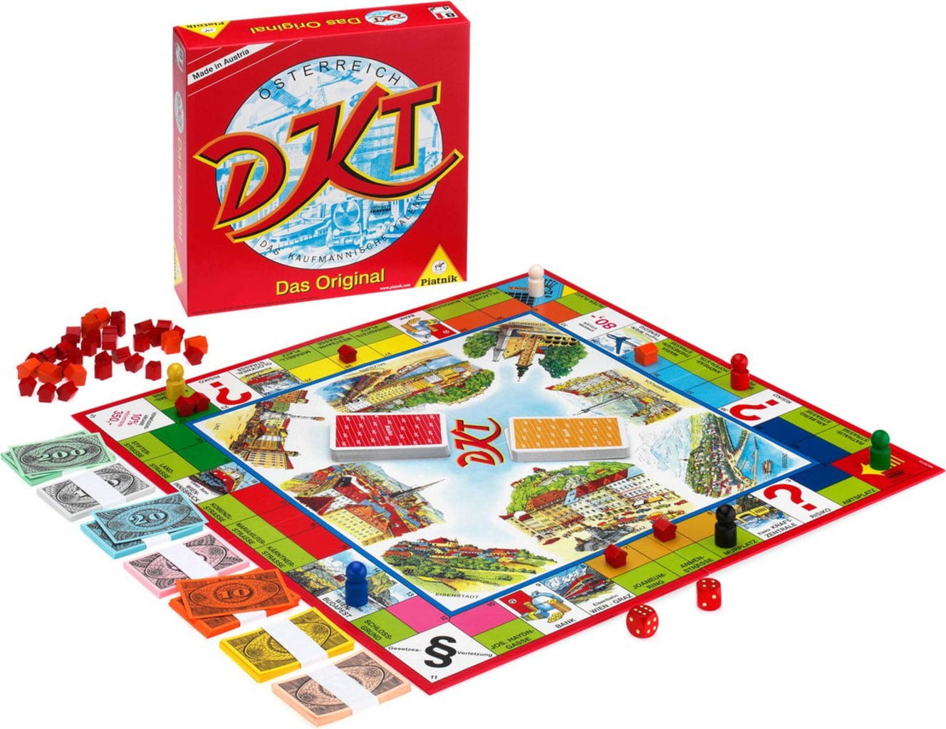 DKT - The Original de Piatnik es un popular juego de culto austriaco. Los jugadores deben enriquecerse comprando y vendiendo terrenos, edificios y empresas de transporte en Austria. El jugador que lo gestione todo con mayor habilidad y previsión gana. DKT es ideal para 3-6 jugadores y a partir de 8 años.
