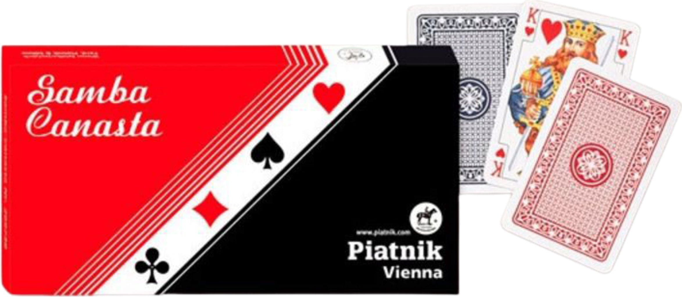 La samba, o canasta de tres barajas, es una de las variantes más antiguas de este juego de cartas. Se juega con cuatro jugadores en parejas, uno frente al otro, y se utilizan tres barajas de cartas francesas. Este juego contiene tres barajas de cartas en un resistente estuche de doble cara.
