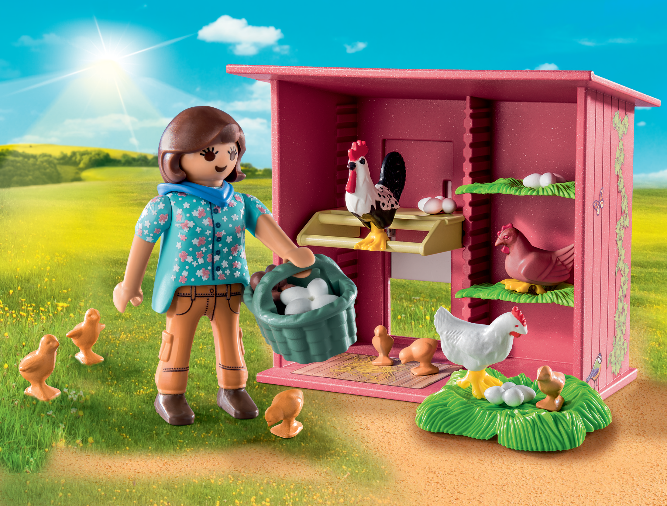 Animales: 2 gallinas, 1 gallo, 6 pollitos; Accesorios: 4 huevos, 2 suelos de hierba, 1 gallinero