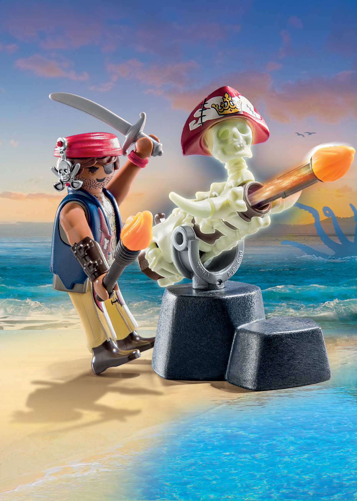 Accesorios: 1 roca con cañón, 2 proyectiles, 1 antorcha, 1 calavera, 1 sombrero pirata, 1 pañuelo con colgante, 1 sable