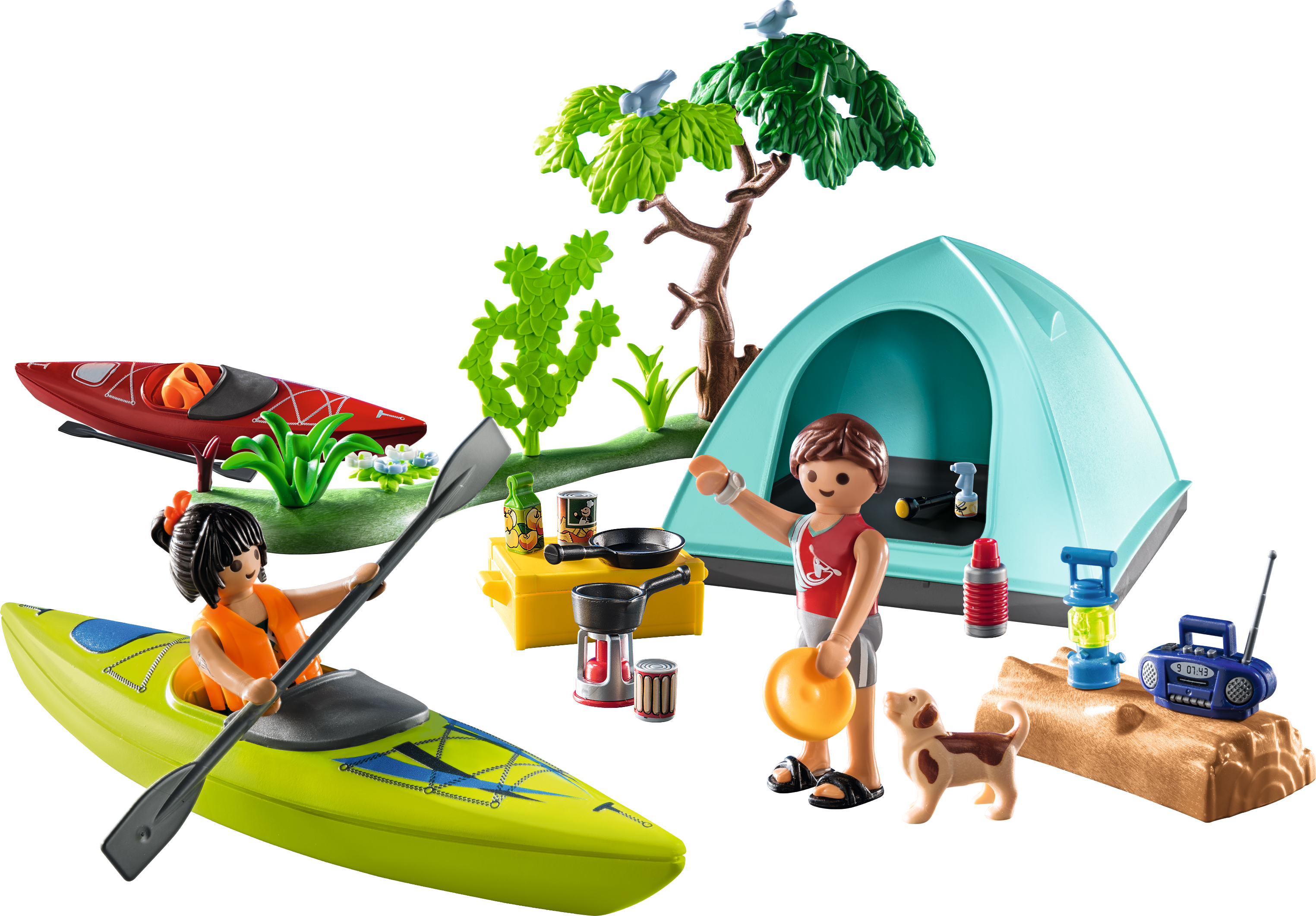 Accesorios: 1 tocón de árbol, 1 lámpara, 1 disco, 1 cocina, 1 olla, 1 radio, 1 lata, 1 lata de salchichas, 1 caja, 1 sartén, 1 árbol, 1 botella, 1 tienda de campaña, 2 canoas, 2 remos, 1 mochila