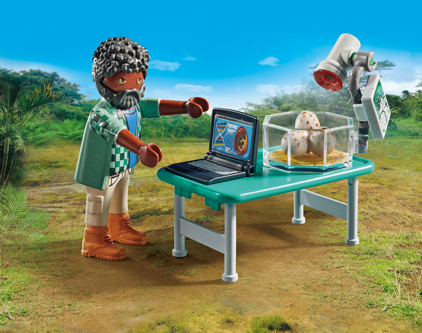 Accesorios: 2 radios, 1 cámara, 1 ordenador portátil, 1 microscopio, 1 mesa, 1 libro, 1 cinta métrica, 1 mochila, 1 incubadora, 3 huevos de dinosaurio, 1 nido, 1 mata de hierba, 1 colina cubierta de hierba con plantas, 1 vela, 1 vehículo, 1 caja, 1 bidón de gasolina, 1 mapa, 2 tarjetas de conocimientos sobre dinosaurios
