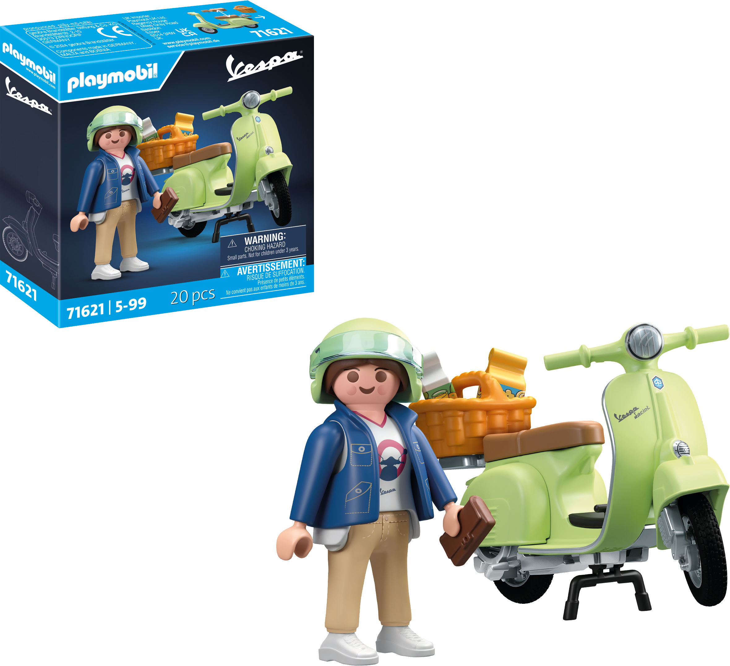 Accesorios: 1 Vespa, 2 sillines Vespa marrones, 1 casco, 1 cesta, 1 bolso, 1 paquete de galletas, 1 cartón de zumo