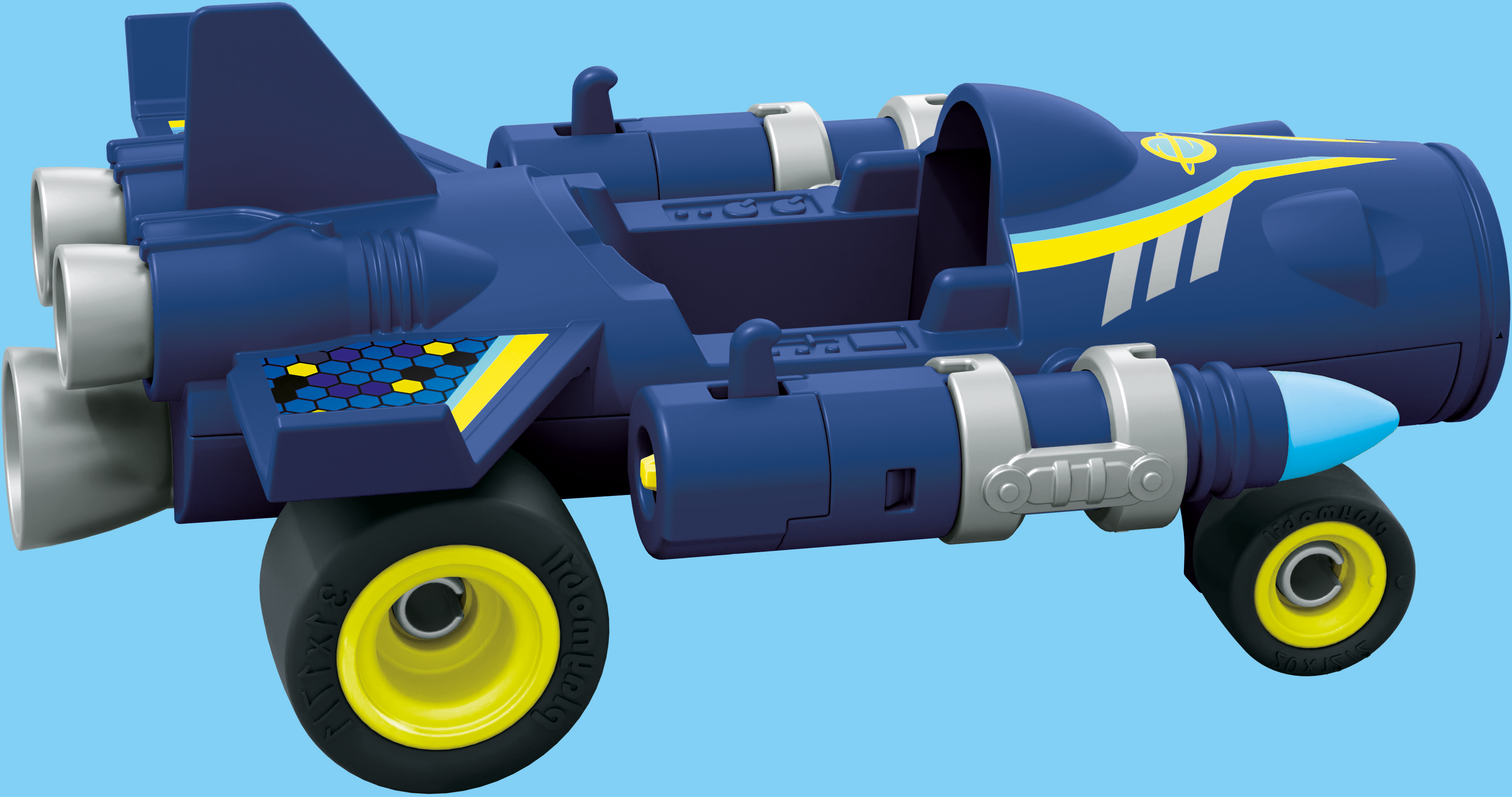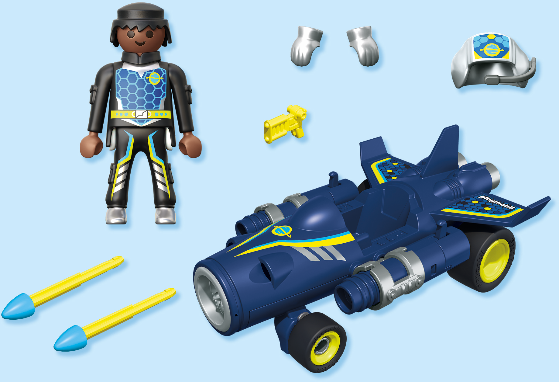 Contenido: 1 hombre, 1 vehículo cohete, 3 proyectiles cohete, 2 accesorios para guantes, 1 casco, 1 arma de fuego portátil.