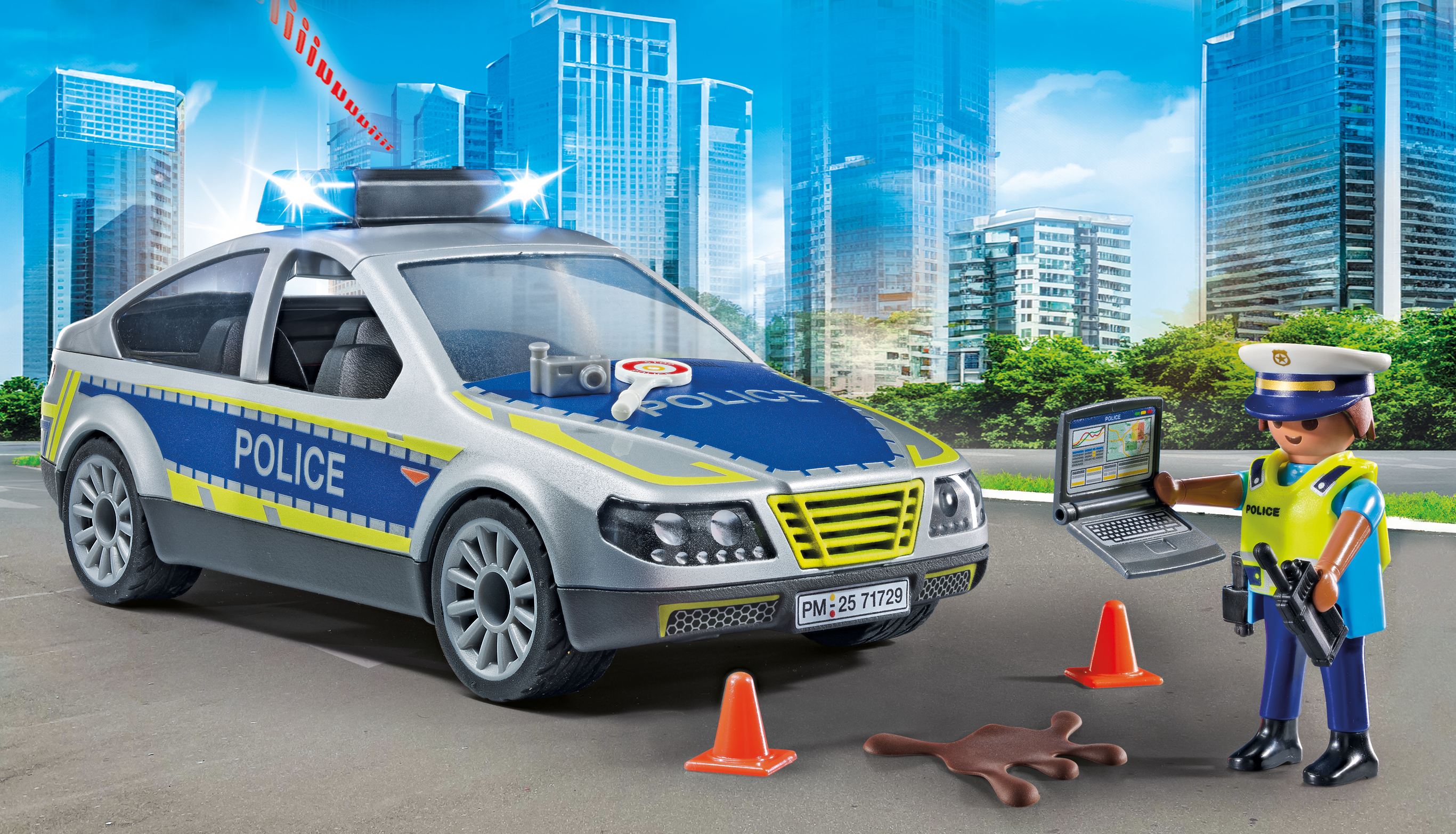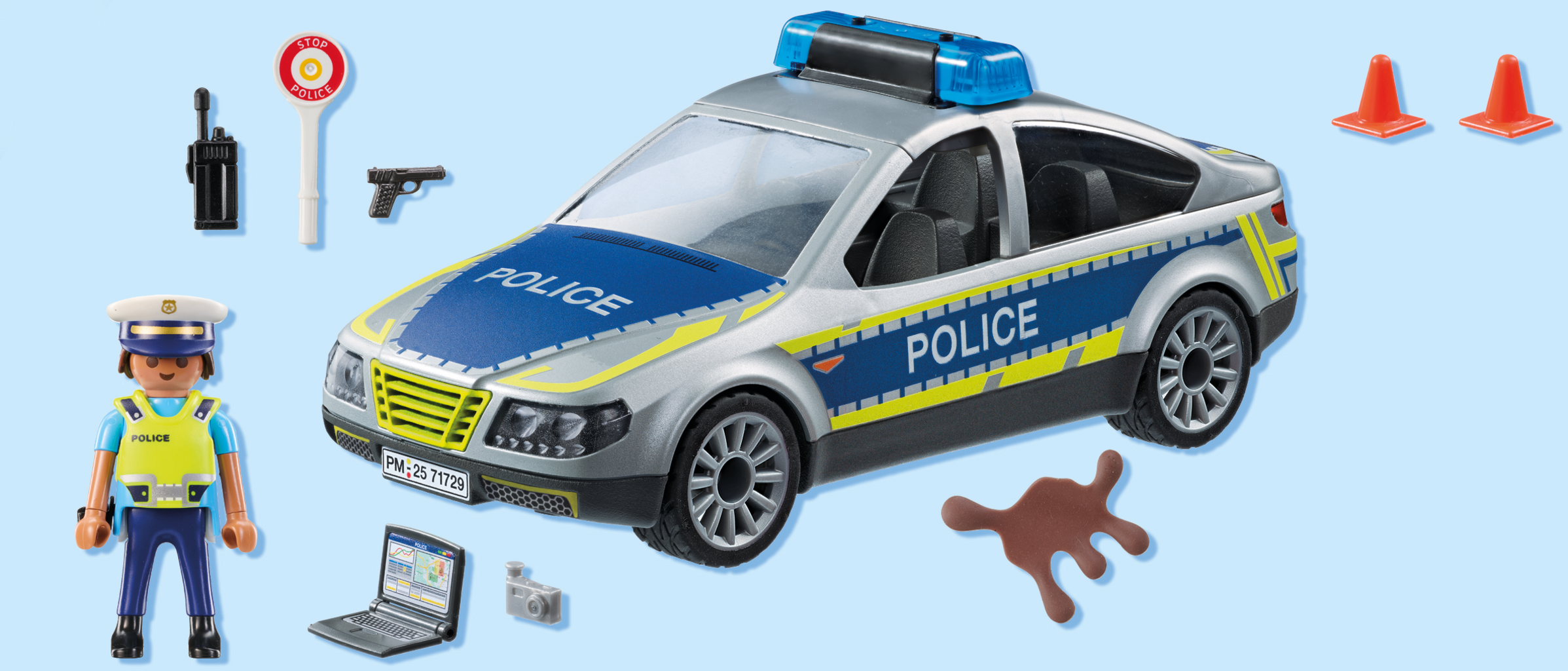 Accesorios: 1 coche patrulla con módulo de luz y sonido, 1 funda con pistola, 1 chaleco de alta visibilidad, 1 radioteléfono móvil, 1 cámara, 1 cuaderno, 1 paleta de policía, 1 mancha de aceite, 2 conos de tráfico