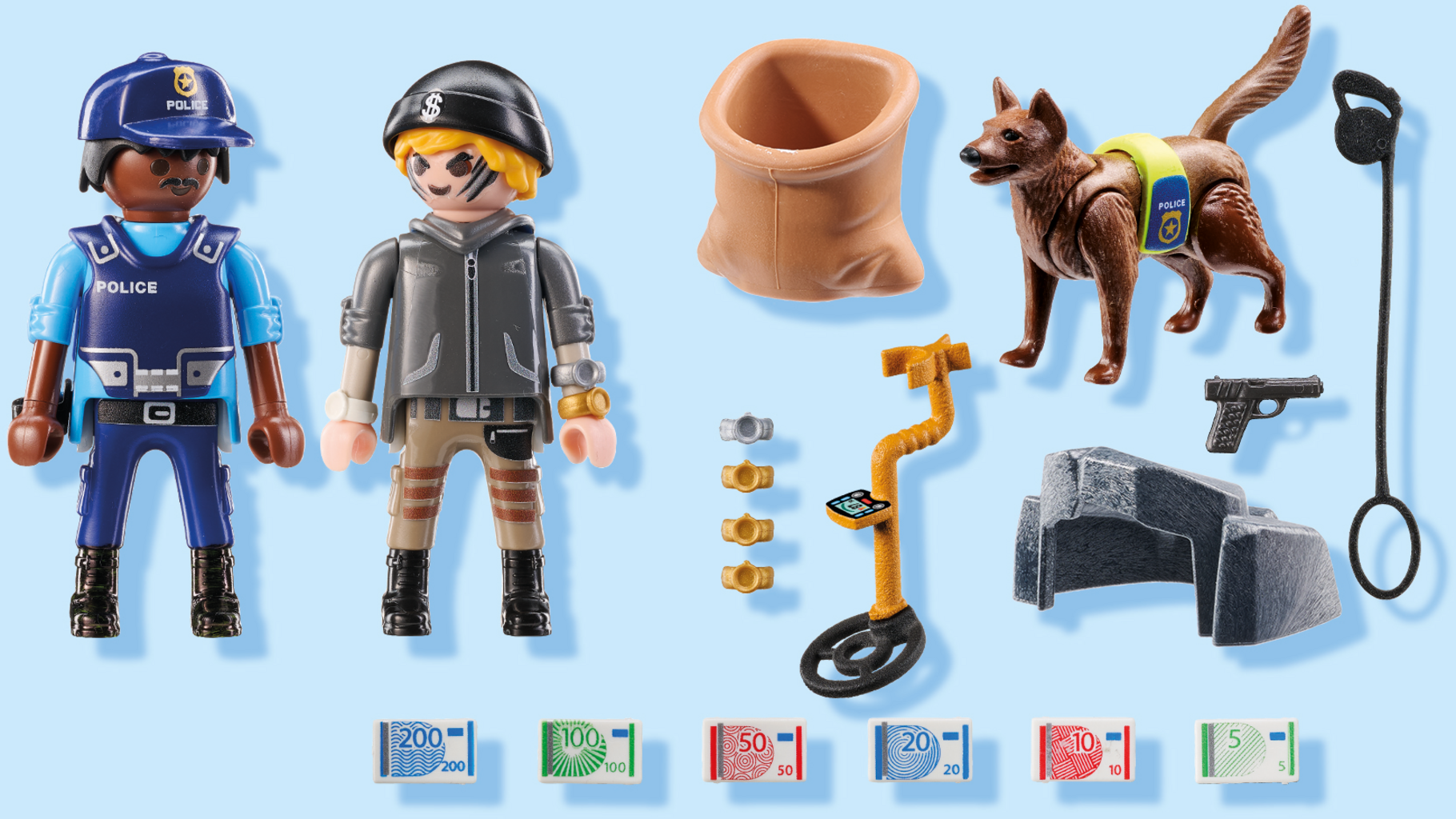 Accesorios: 1 saco de yute, 1 piedra pequeña, 1 fajo de billetes, 6 relojes de pulsera, 1 detector de metales, 1 chaleco de policía, 1 funda con pistola, 1 correa para el perro, 1 chaleco de seguridad para el perro
