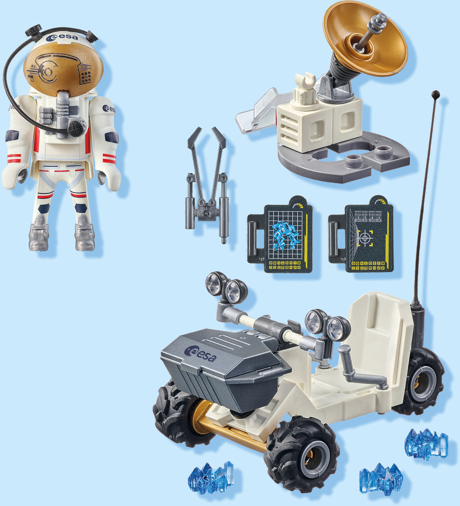 Accesorios: 1 vehículo Marte con 2 luces y caja de transporte, 2 barras de dirección, 1 antena, 1 pantalla pequeña, 1 panel solar, 1 antena parabólica con antena, 1 pantalla grande, 1 cable, 2 pies, 2 muestras de rocas, 1 casco de astronauta, 1 mochila de astronauta, 1 manguera de oxígeno, 1 antena pequeña, 1 pinza, 2 fundas con clip