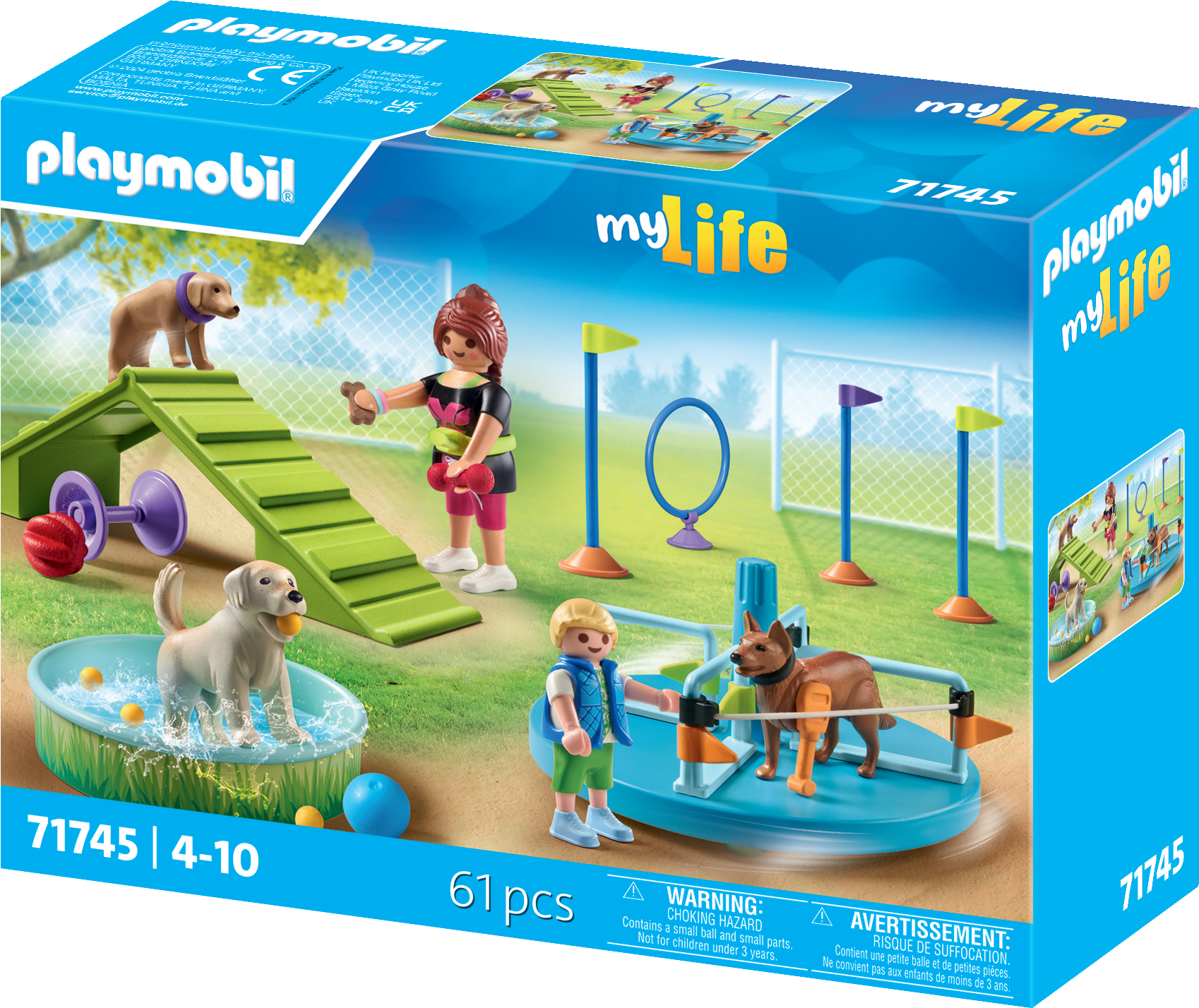 Accesorios: 3 postes de eslalon con banderas, 1 tiovivo con banderas, 2 bandas de goma para barreras, 1 anillo con placa base, 1 piscina infantil, 4 pelotas pequeñas, 1 pelota grande con asa, 1 rampa para correr, 4 juguetes para perros, 4 croquetas, 1 cinturón, 1 correa para perros, 2 collares para perros, 2 anillos de silicona para brazos