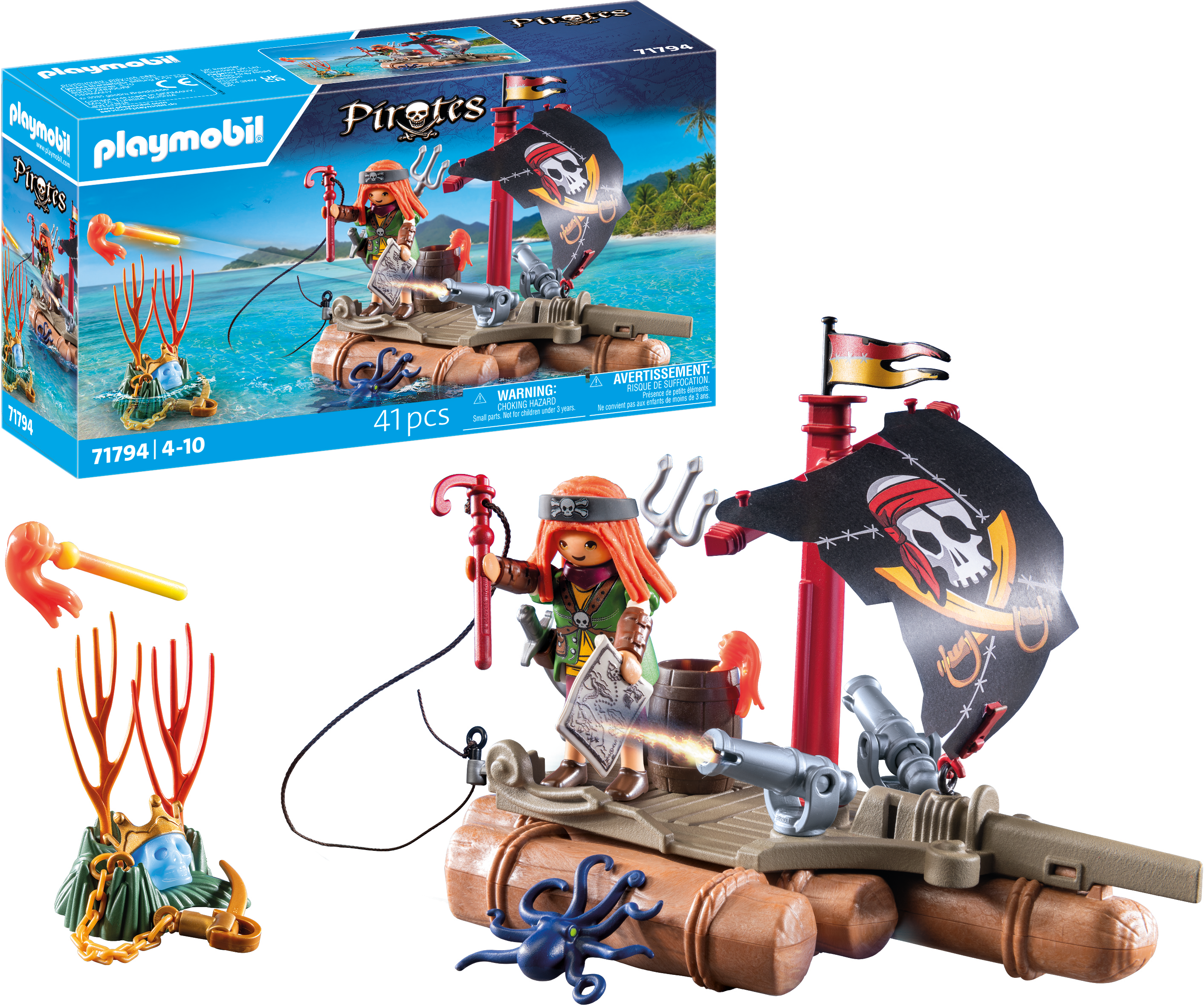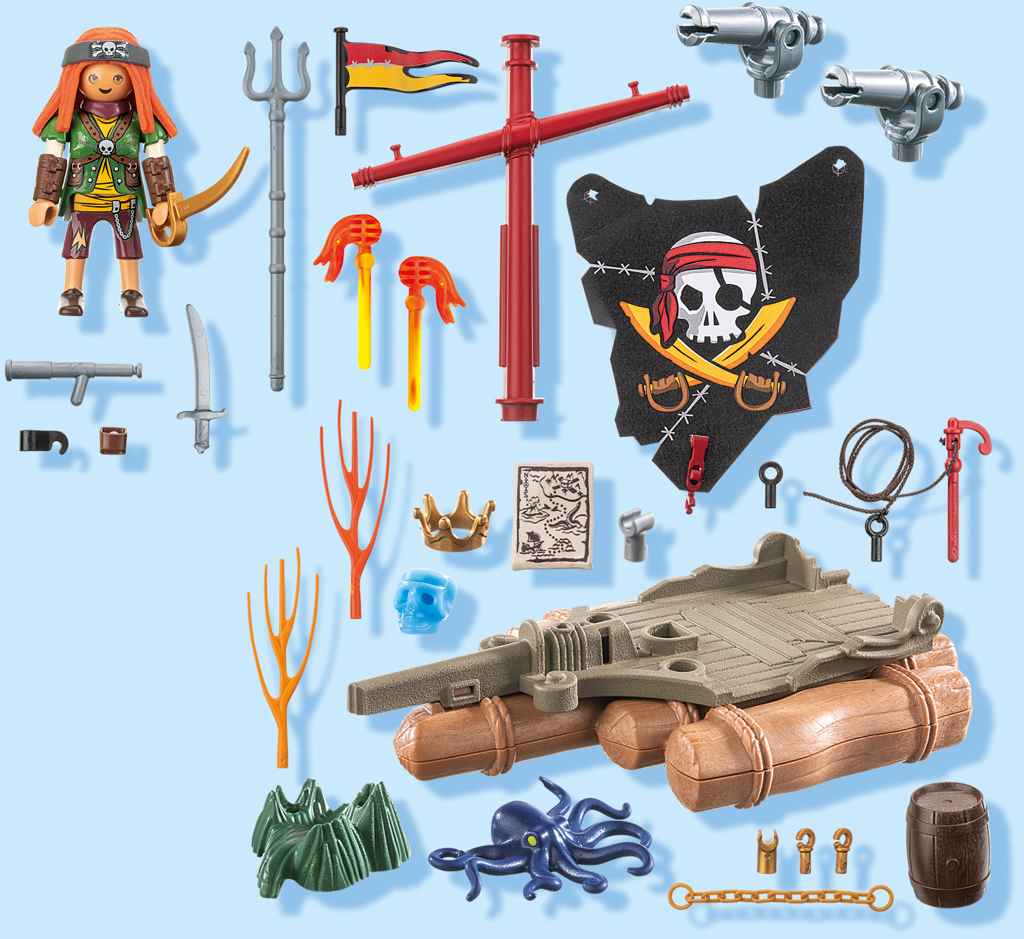 Accesorios: 1 balsa, 1 bandera, 1 mástil, 1 vela, 1 cuerda con proyectil en forma de gancho, 2 cañones, 2 proyectiles de fuego, 1 barril, 1 tridente, 1 placa base, 2 andamios, 2 sables, 1 cadena, 1 calavera de cristal, 1 corona, 1 mapa, 1 catalejo, 1 cinta para la cabeza, 2 esposas para los brazos, 1 clip