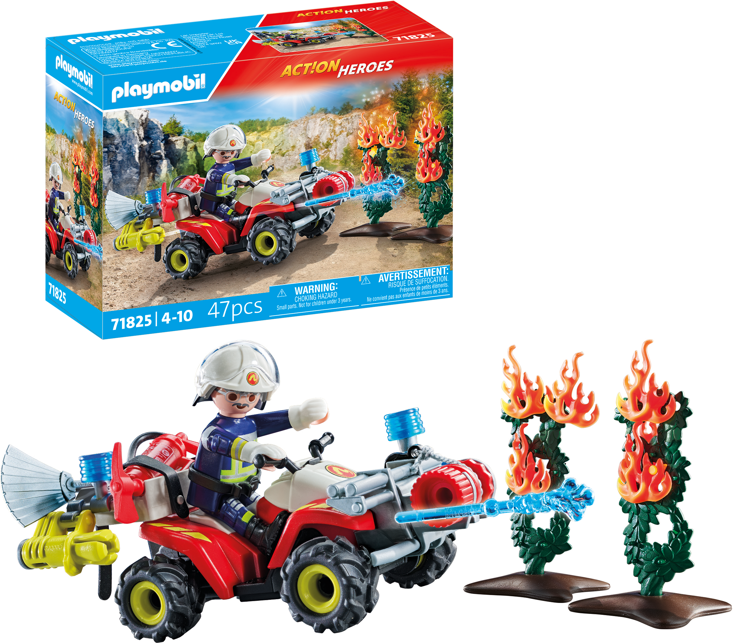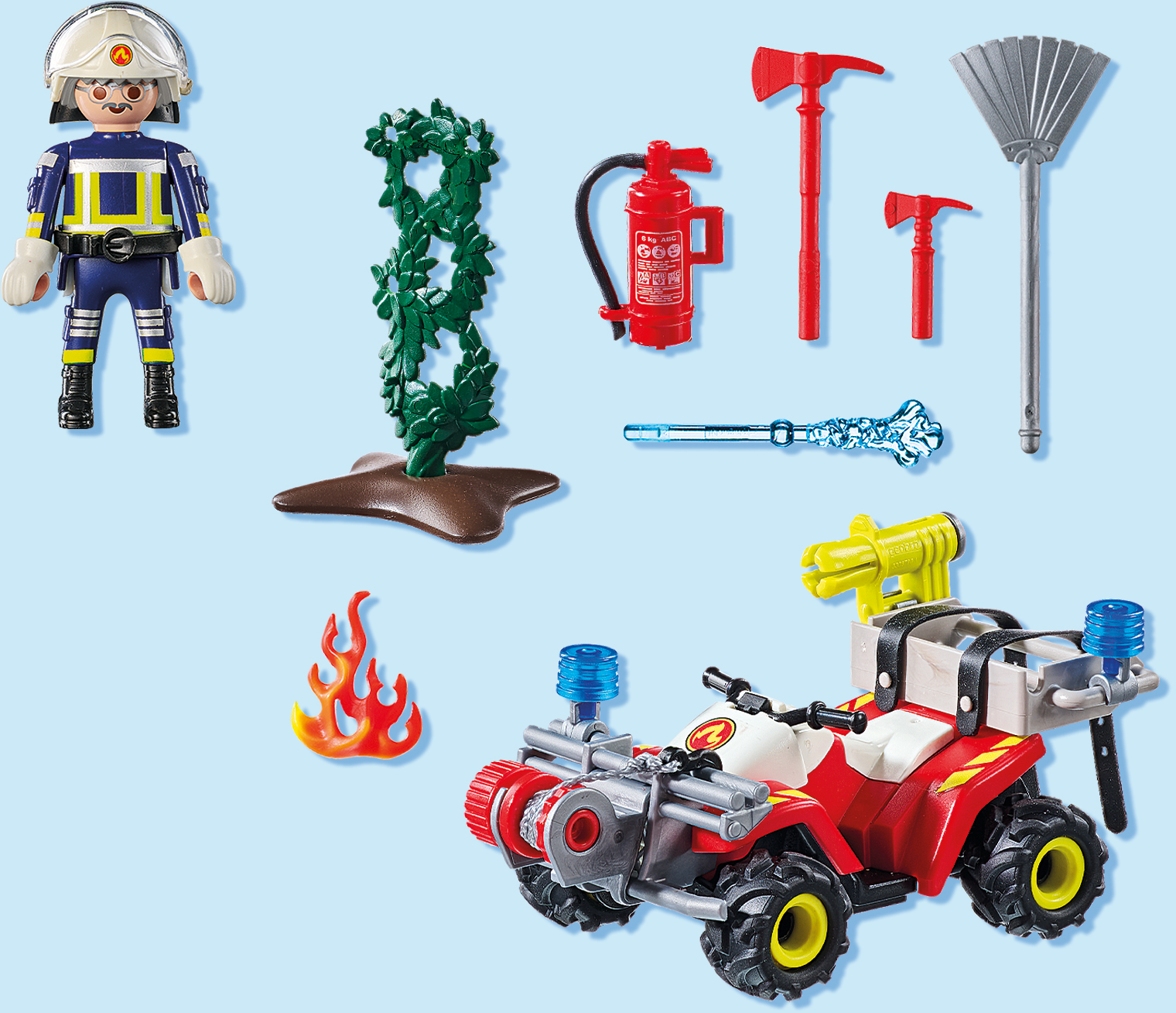 Accesorios: 1 quad con cabestrante de cable y gancho, 2 enganches de cinturón, 1 cañón con 2 flechas de agua, 1 extintor, 2 hachas, 2 pequeñas luces azules, 2 arbustos con 2 placas base, 4 llamas, 1 cepillo de incendios