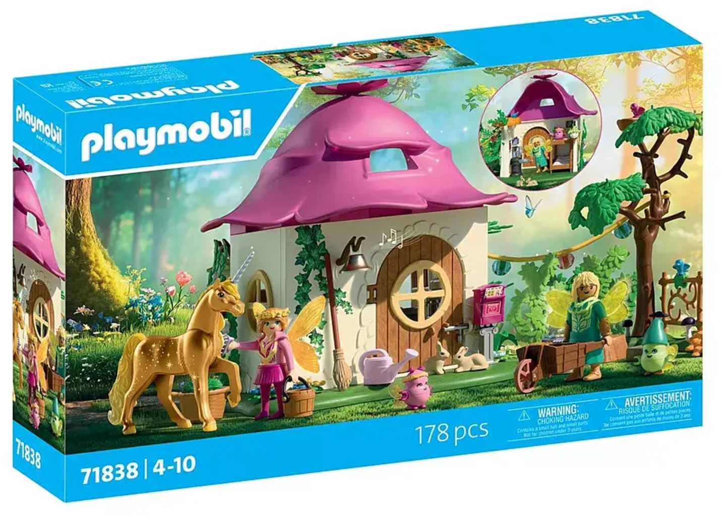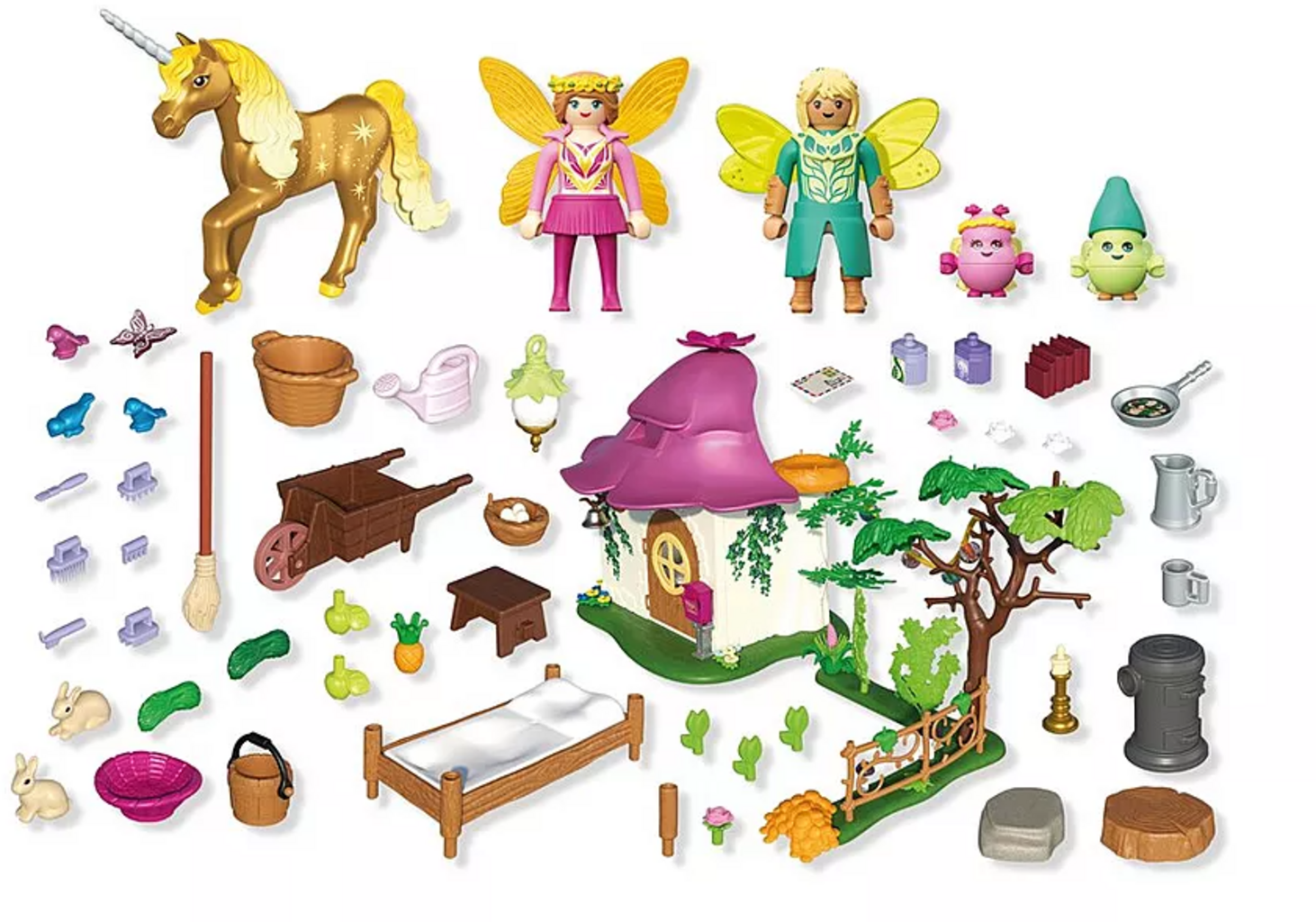 Contenido: 1 mujer, 1 hombre, 2 joylings, 1 unicornio, 1 mariposa, 2 pájaros, 2 conejos; accesorios: 1 casa de hadas con placa base, 1 nido de paja, 1 buzón, 2 camas, utensilios de cocina, 1 candelabro, 1 taburete, 1 pila de libros, 1 timbre, 1 lampignon, 1 flor grande, 1 árbol, plantas, 3 setas, flores, 1 elemento de valla, 1 carretilla, 1 tocón de árbol, 1 guirnalda, 2 rocas de piedra, 1 escoba, 1 regadera, accesorios para el cuidado del unicornio, 2 cestas, 1 cubo, 1 corona de flores, 4 alas, 1 collar de alas, 2 puños, 1 tocado de hojas, 2 pares de alas pequeñas, 1 sombrero infantil, 1 corona de hojas infantil, 1 rosa de ramillete