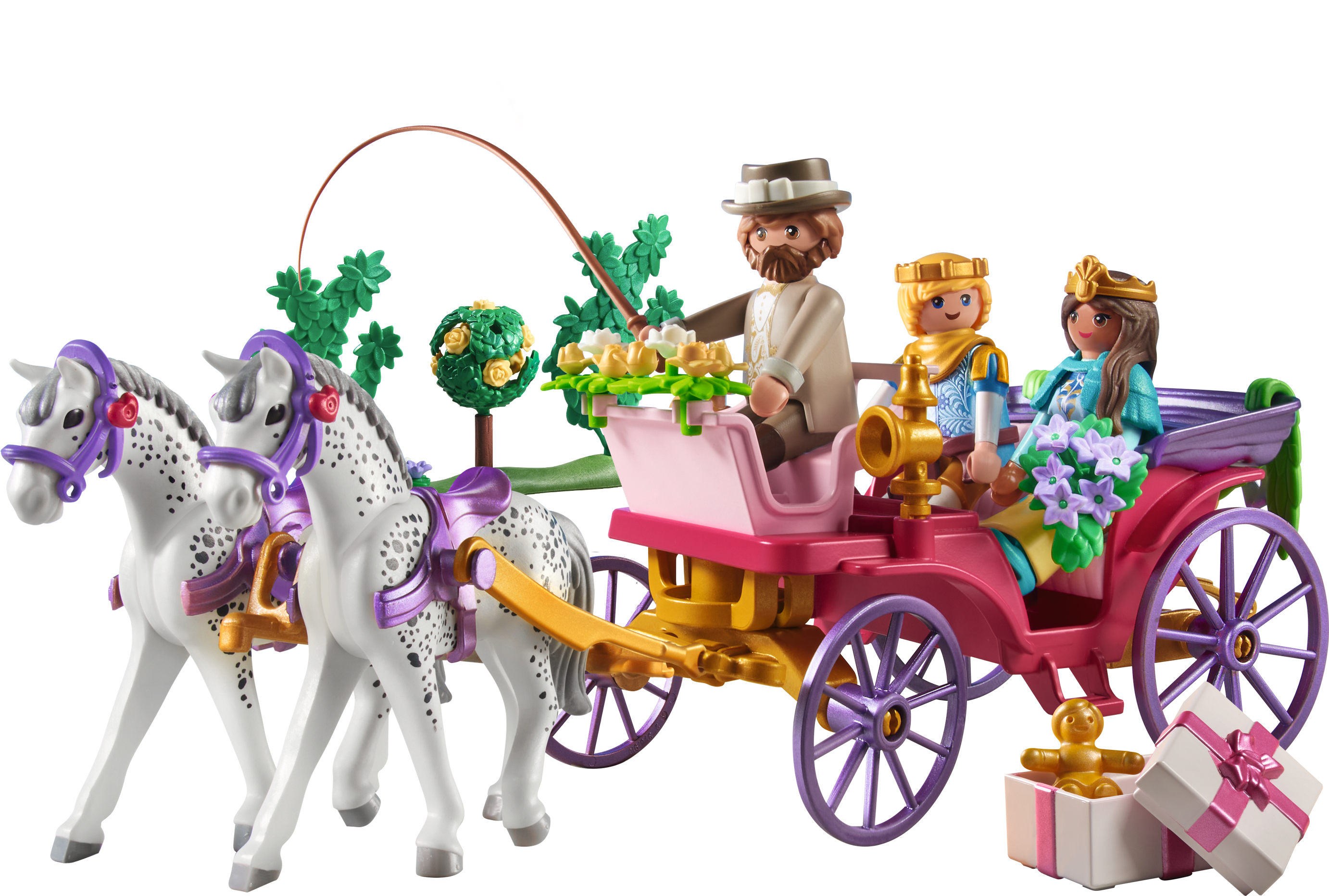 Contenido: 1 princesa, 1 príncipe, 1 cochero, 2 caballos, 1 carruaje con adornos florales y lazos, 1 zona verde, 1 rosal, 2 plantas verdes, 1 planta con flores, 2 sillas de montar, 2 cabestros, 4 tachuelas de corazón para cabestros, 4 tachuelas de estrella para cabestros, 4 lazos para cabestros, 1 ramo de flores, 1 regalo, 1 muñeca, 1 cesta, 1 haz de heno, 2 coronas, 1 sombrero con lazo, 1 cosecha