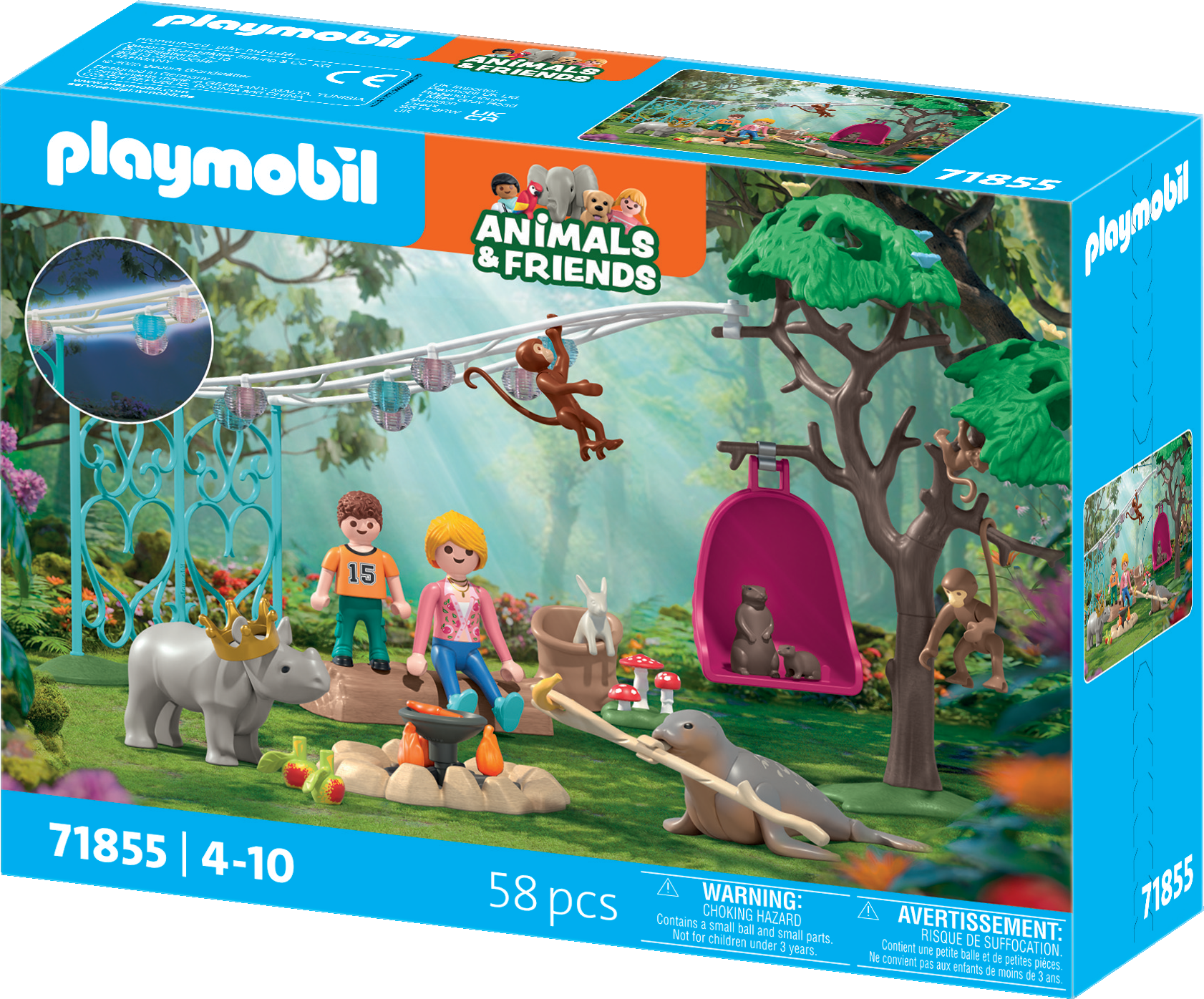 Celebra una fantástica fiesta en el bosque con rinocerontes, focas, conejos, monos y muchos otros amigos. Una hoguera, una barbacoa, una guirnalda de farolillos y una hamaca harán que la fiesta sea mágica, sobre todo al anochecer. Este set se puede combinar con otros sets de la serie Animals & Friends para una diversión sin fin.