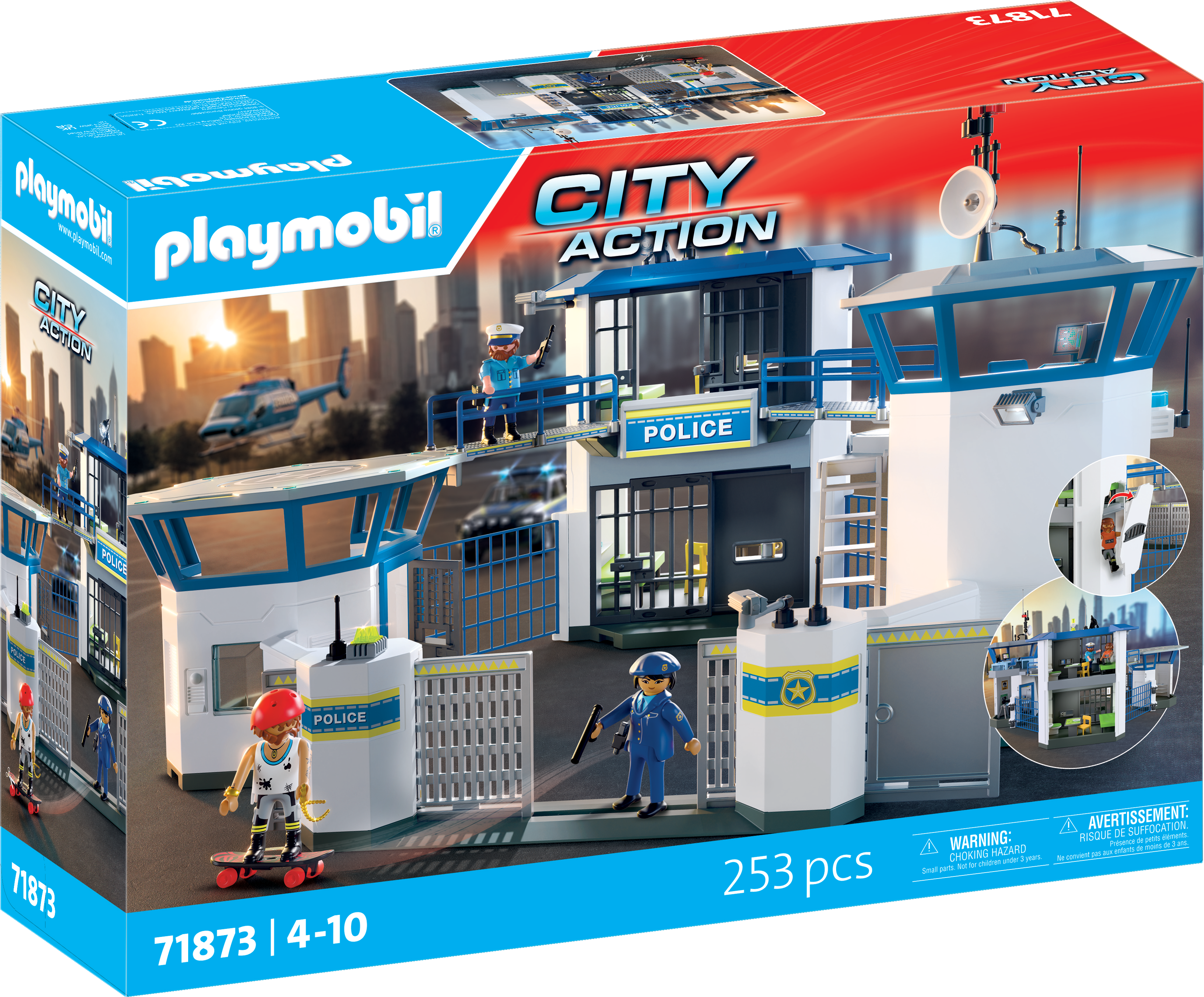 ¡Aquí los malos no tienen ninguna oportunidad! En la comisaría se controla a los ladrones, se escanean las huellas dactilares y se planifican las misiones. Con una armería, una celda, una sala de control y muchos accesorios, los niños pueden revivir emocionantes operaciones policiales. Ya sea una persecución en monopatín, un ingenioso juego del escondite o una misión en helicóptero, este set ofrece un sinfín de aventuras llenas de acción y creatividad.