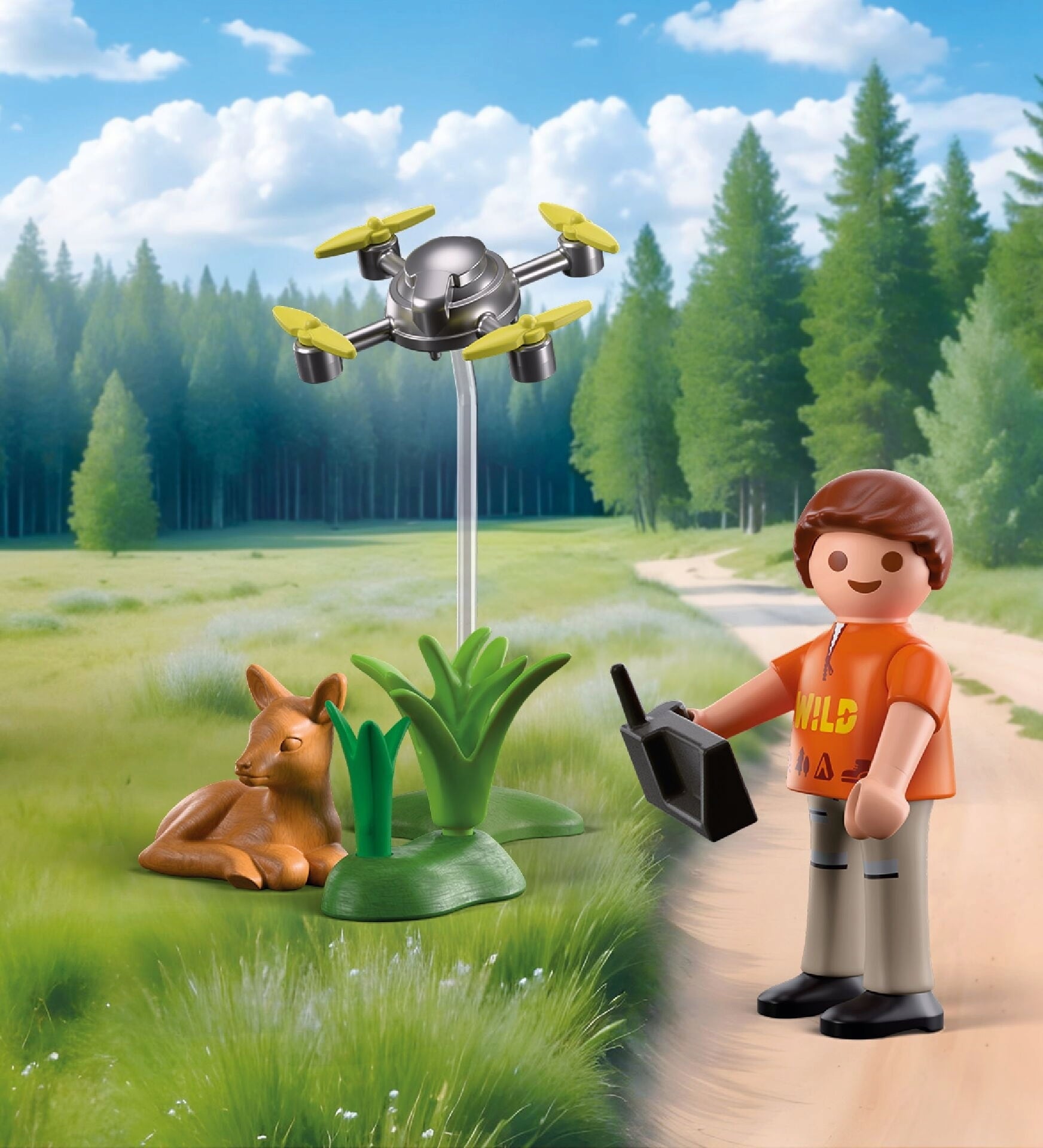 Contenido: 1 niño con gorro, 1 cervatillo, 1 dron, 1 arbusto, 1 unidad de control para dron
