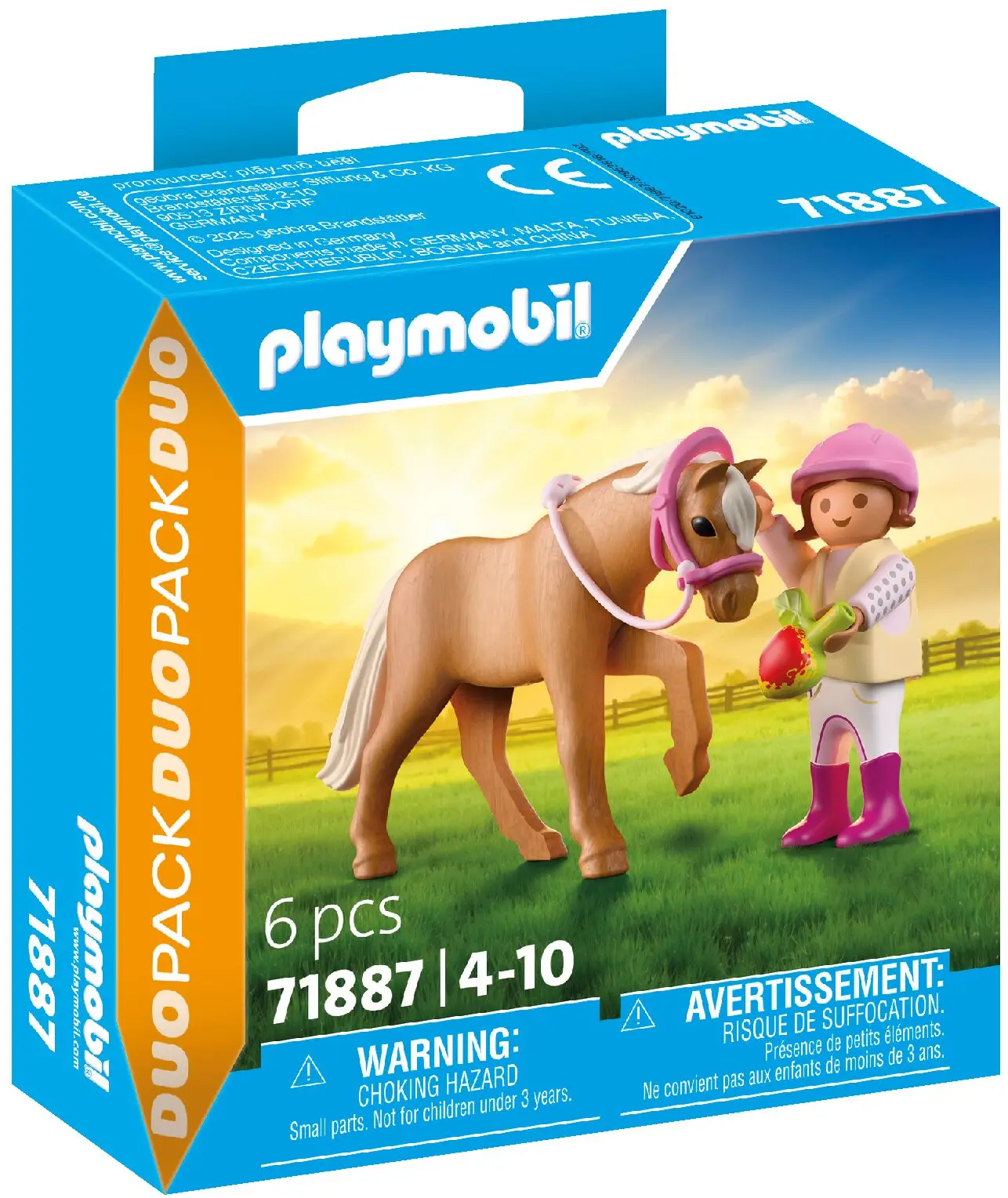Contenido: 1 niña con casco y chaleco, 1 poni, 1 brida, 1 manzana
