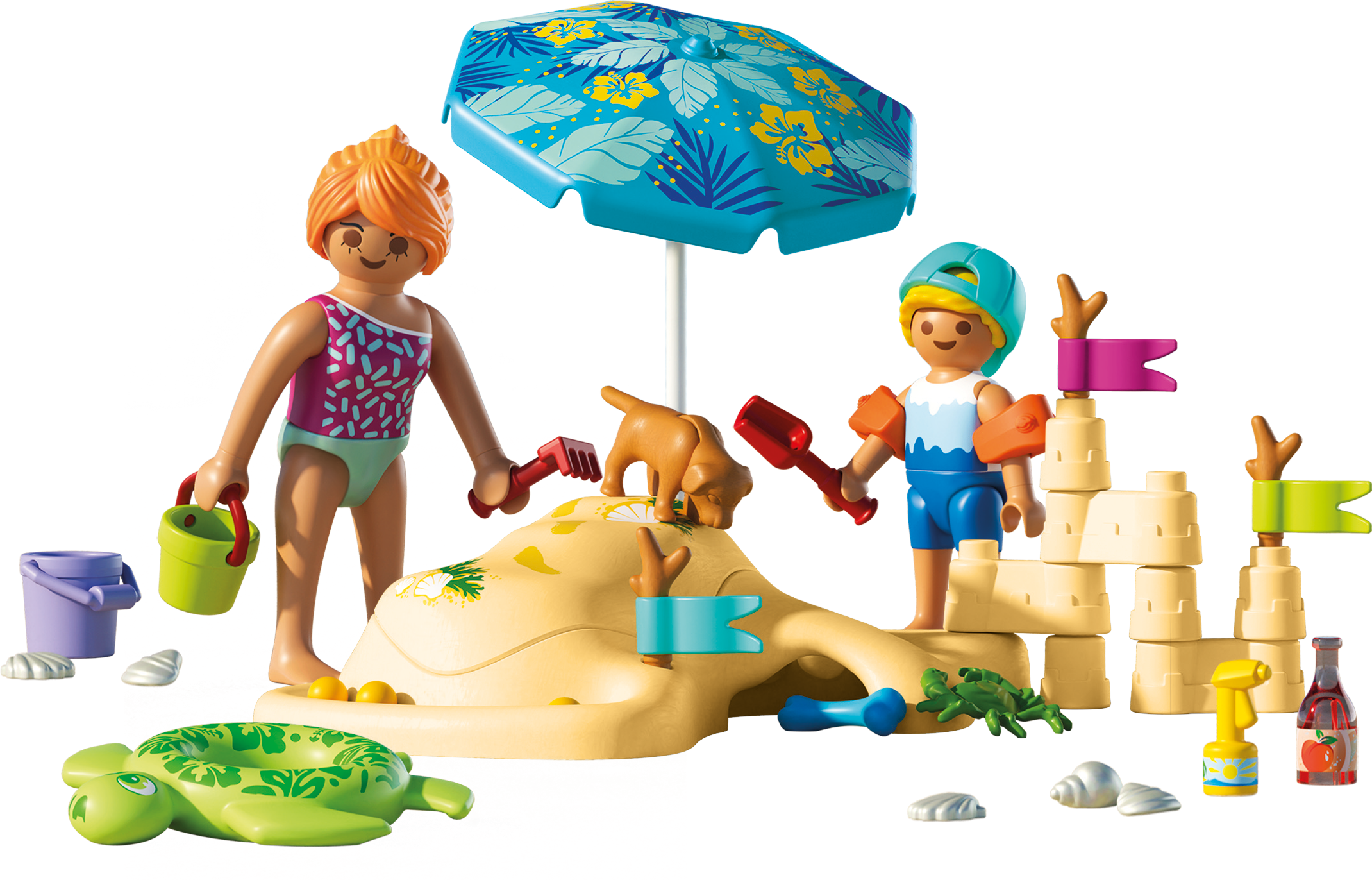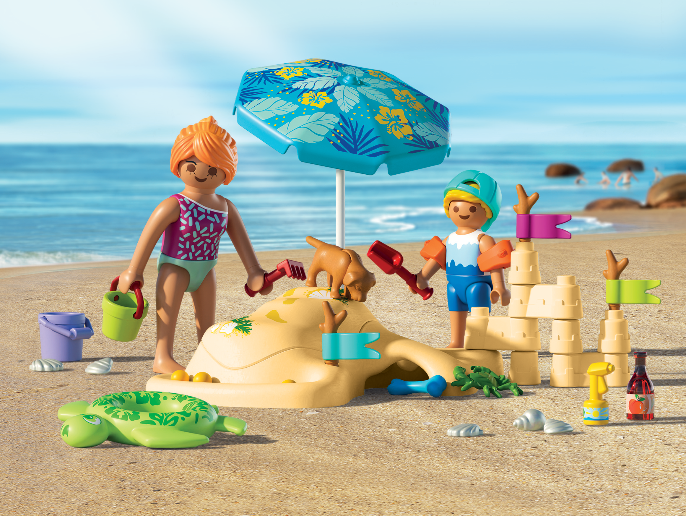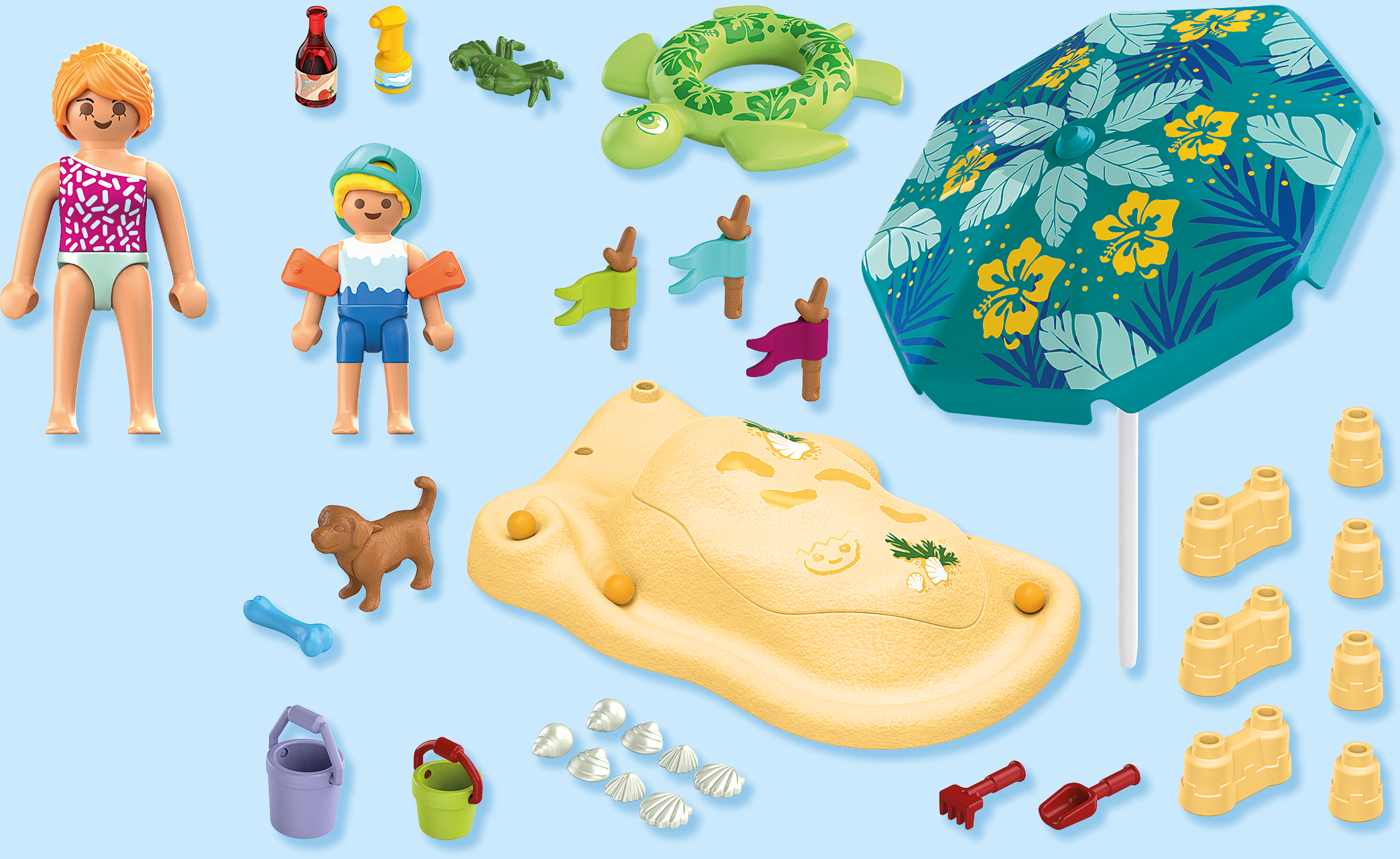 Contenido: 1 mujer, 1 niño con gorra, 1 perro, 1 cangrejo, 1 elemento de playa con tapa extraíble y elementos individuales para castillos de arena, 1 sombrilla, 3 banderas en una rama, 3 canicas, 1 juego de conchas, 1 botella de bebida, 1 crema solar, 1 cubo con pala y rastrillo, 1 aro de natación y alas acuáticas