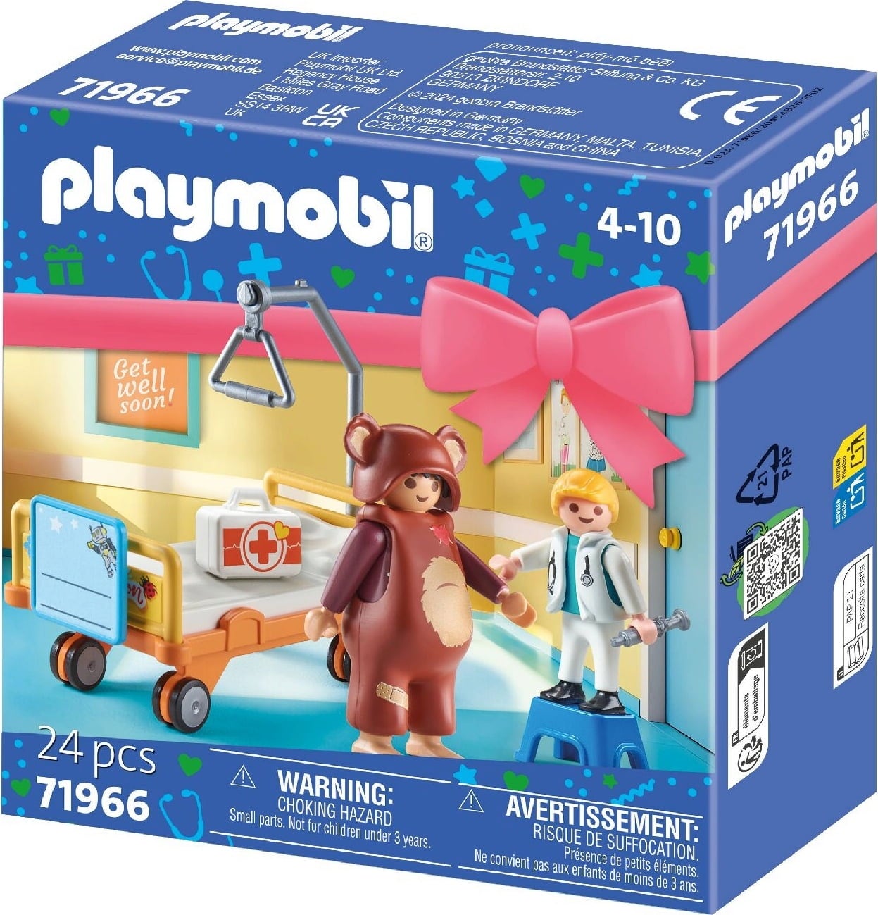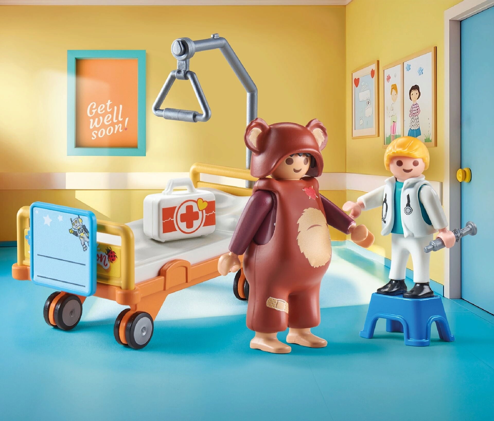 Contenido: 1 disfraz de hombre, 1 disfraz de niño, 1 disfraz de oso con gorro, 1 cama de hospital con tablero de paciente personalizable, taburete, 1 maletín de médico con equipo, 1 hoja de pegatinas con diversos emplastos y vendas