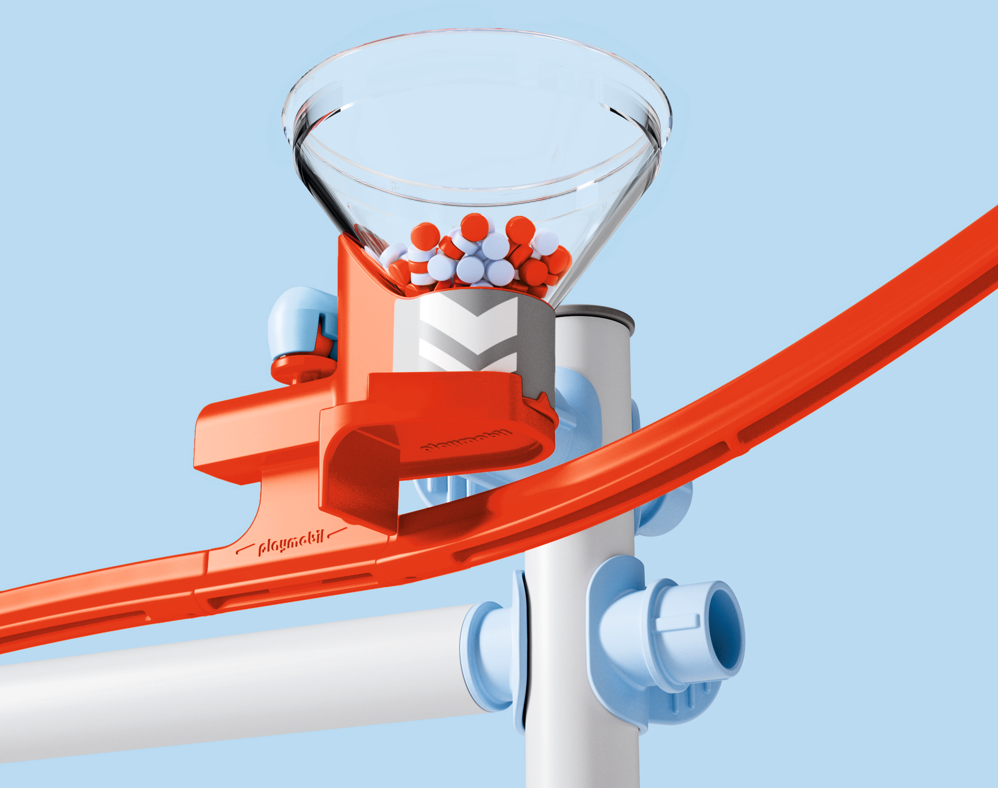 Contenido: 1 hombre, 1 mujer, 5 soportes, 18 tubos y conectores de tubo, 6 tapones de tubo, 20 abrazaderas, 16 adaptadores, 15 raíles adaptadores con rótula, 10 raíles, 4 conectores de raíl, 1 abrazadera de tornillo, 2 arrancadores, 2 piezas finales / saltos, 1 embudo con confeti, 1 hélice, 1 pista ondulada, 1 deslizador