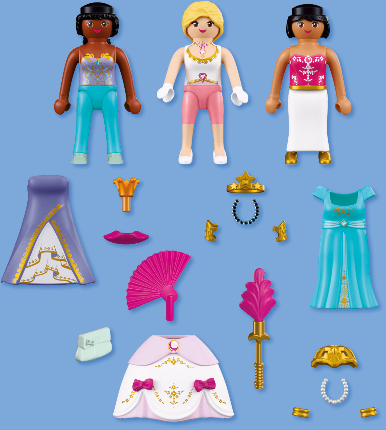 - Accesorios: 2 vestidos, 1 falda, 1 corona, 1 corona de estrellas, 1 redecilla para el pelo, 1 abanico, 1 collar, 2 collares, 1 cetro con pluma, 2 pulseras, 2 brazaletes